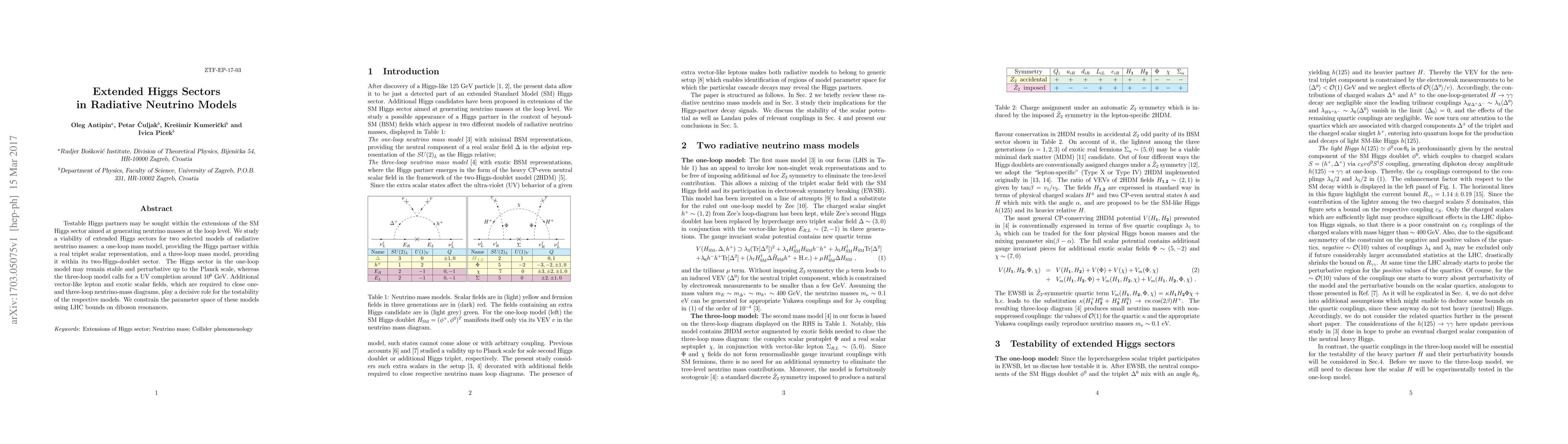 Testable Higgs partners may be sought within the extensions of the SM Higgs sector aimed at generating neutrino masses at the loop level. We study a viability of extended Higgs sectors for two selected models of radiative neutrino masses: a one-loop mass model, providing the Higgs partner within a real triplet scalar representation, and a three-loop mass model, providing it within its two-Higgs-doublet sector. The Higgs sector in the one-loop model may remain stable and perturbative up to the Planck scale, whereas the three-loop model calls for a UV completion around 106 GeV. Additional vector-like lepton and exotic scalar fields, which are required to close one- and three-loop neutrino-mass diagrams, play a decisive role for the testability of the respective models. We constrain the parameter space of these models using LHC bounds on diboson resonances.