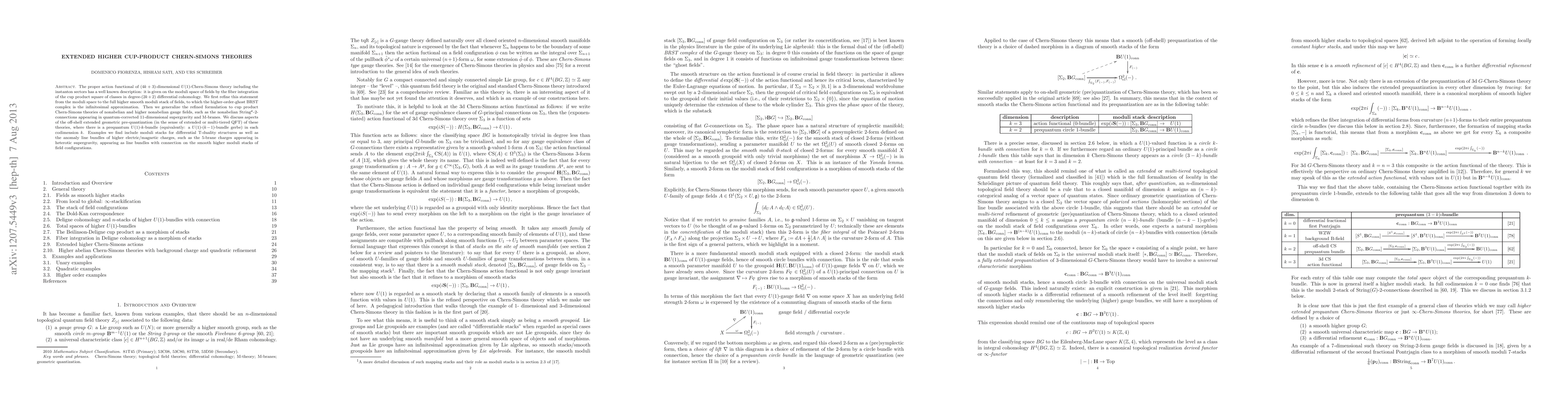The proper action functional of (4k+3)-dimensional U(1)-Chern-Simons theory including the instanton sectors has a well known description: it is given on the moduli space of fields by the fiber integration of the cup product square of classes in degree-(2k+2) differential cohomology. We first refine this statement from the moduli space to the full higher smooth moduli stack of fields, to which the higher order-ghost BRST complex is the infinitesimal approximation. Then we generalize the refined formulation to cup product Chern-Simons theories of nonabelian and higher nonabelian gauge fields, such as the nonabelian String^c-2-connections appearing in quantum-corrected 11-dimensional supergravity and M-branes. We discuss aspects of the off-shell extended geometric pre-quantization (in the sense of extended or multi-tiered QFT) of these theories, where there is a prequantum U(1)-k-bundle (equivalently: a U(1)-(k-1)-bundle gerbe) in each codimension k. Examples we find include moduli stacks for differential T-duality structures as well as the anomaly line bundles of higher electric/magnetic charges, such as the 5-brane charges appearing in heterotic supergravity, appearing as line bundles with connection on the smooth higher moduli stacks of field configurations.