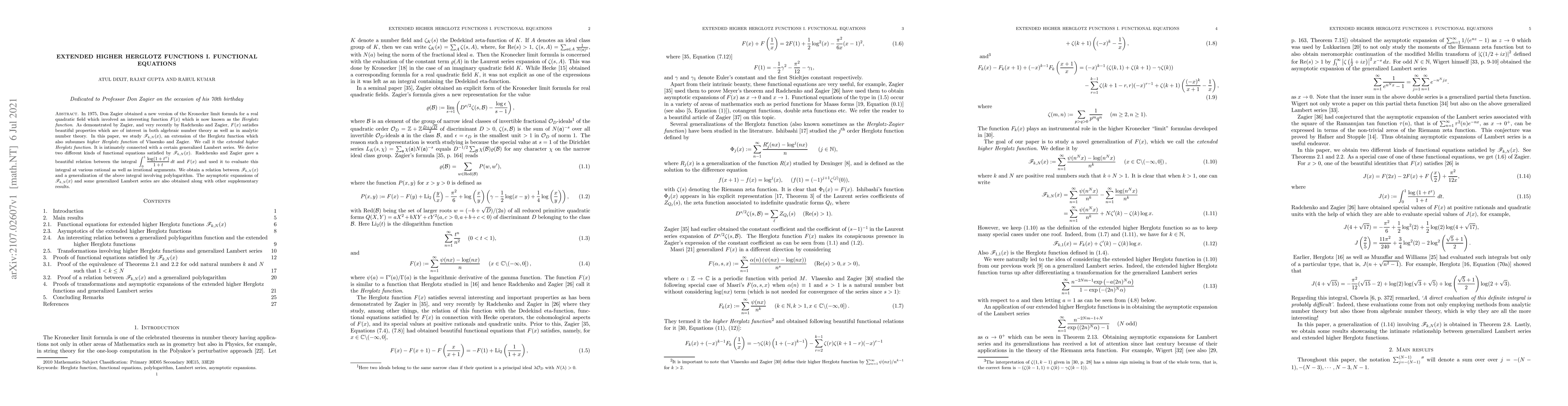 In 1975, Don Zagier obtained a new version of the Kronecker limit formula for a real quadratic field which involved an interesting function $F(x)$ which is now known as the \emph{Herglotz function}. As demonstrated by Zagier, and very recently by Radchenko and Zagier, $F(x)$ satisfies beautiful properties which are of interest in both algebraic number theory as well as in analytic number theory. In this paper, we study $\mathscr{F}_{k,N}(x)$, an extension of the Herglotz function which also subsumes \emph{higher Herglotz function} of Vlasenko and Zagier. We call it the \emph{extended higher Herglotz function}. It is intimately connected with a certain generalized Lambert series. We derive two different kinds of functional equations satisfied by $\mathscr{F}_{k,N}(x)$. Radchenko and Zagier gave a beautiful relation between the integral $\displaystyle\int_{0}^{1}\frac{\log(1+t^x)}{1+t}\, dt$ and $F(x)$ and used it to evaluate this integral at various rational as well as irrational arguments. We obtain a relation between $\mathscr{F}_{k,N}(x)$ and a generalization of the above integral involving polylogarithm. The asymptotic expansions of $\mathscr{F}_{k, N}(x)$ and some generalized Lambert series are also obtained along with other supplementary results.