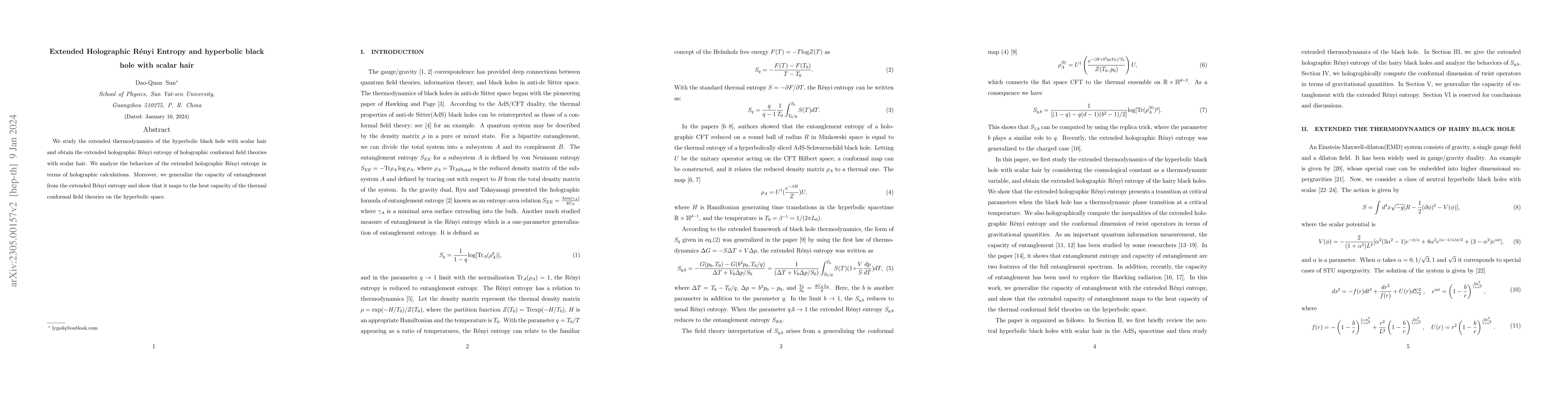 This paper investigates the thermodynamics of hyperbolic black holes with scalar hair, deriving the extended holographic Rényi entropy for conformal field theories with such hair. It also generalizes the entanglement capacity from the extended Rényi entropy, linking it to the heat capacity of thermal conformal field theories on hyperbolic space.