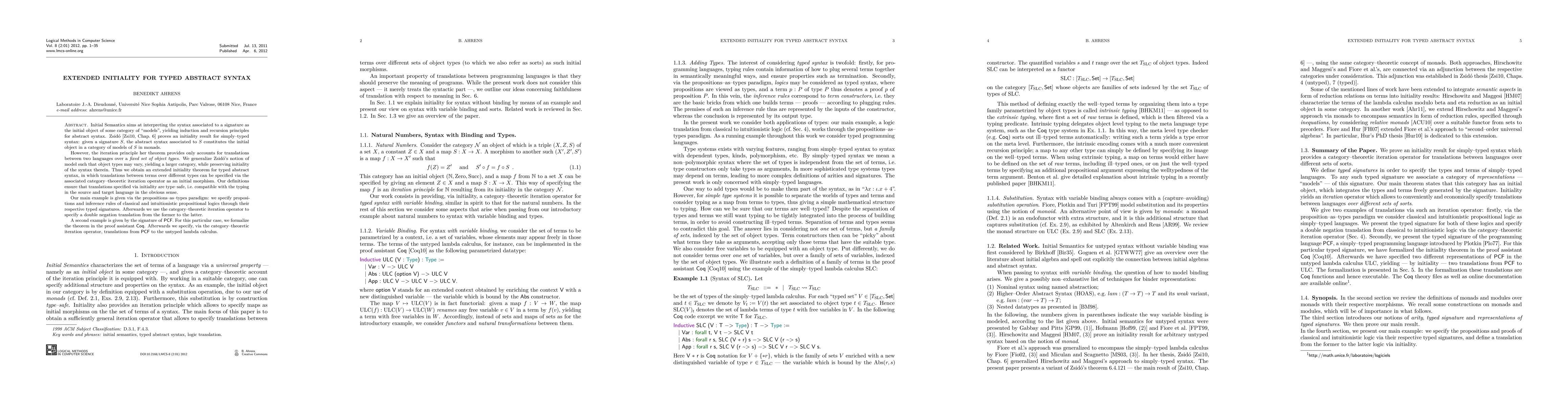Initial Semantics aims at interpreting the syntax associated to a signature as the initial object of some category of 'models', yielding induction and recursion principles for abstract syntax. Zsid\'o proves an initiality result for simply-typed syntax: given a signature S, the abstract syntax associated to S constitutes the initial object in a category of models of S in monads. However, the iteration principle her theorem provides only accounts for translations between two languages over a fixed set of object types. We generalize Zsid\'o's notion of model such that object types may vary, yielding a larger category, while preserving initiality of the syntax therein. Thus we obtain an extended initiality theorem for typed abstract syntax, in which translations between terms over different types can be specified via the associated category-theoretic iteration operator as an initial morphism. Our definitions ensure that translations specified via initiality are type-safe, i.e. compatible with the typing in the source and target language in the obvious sense. Our main example is given via the propositions-as-types paradigm: we specify propositions and inference rules of classical and intuitionistic propositional logics through their respective typed signatures. Afterwards we use the category--theoretic iteration operator to specify a double negation translation from the former to the latter. A second example is given by the signature of PCF. For this particular case, we formalize the theorem in the proof assistant Coq. Afterwards we specify, via the category-theoretic iteration operator, translations from PCF to the untyped lambda calculus.