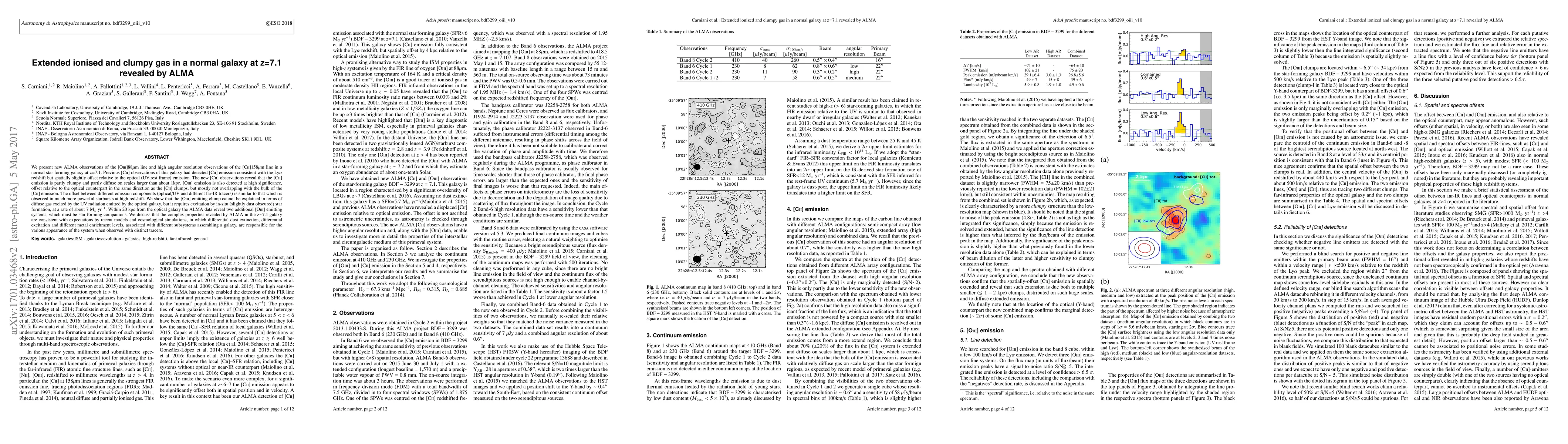 This paper reports ALMA observations revealing extended, clumpy ionised gas in a normal star-forming galaxy at z=7.1, showing offsets between optical and far-IR emissions indicative of differential dust extinction and star formation processes. The findings align with models predicting diverse excitation and metal enrichment in galaxy subsystems.