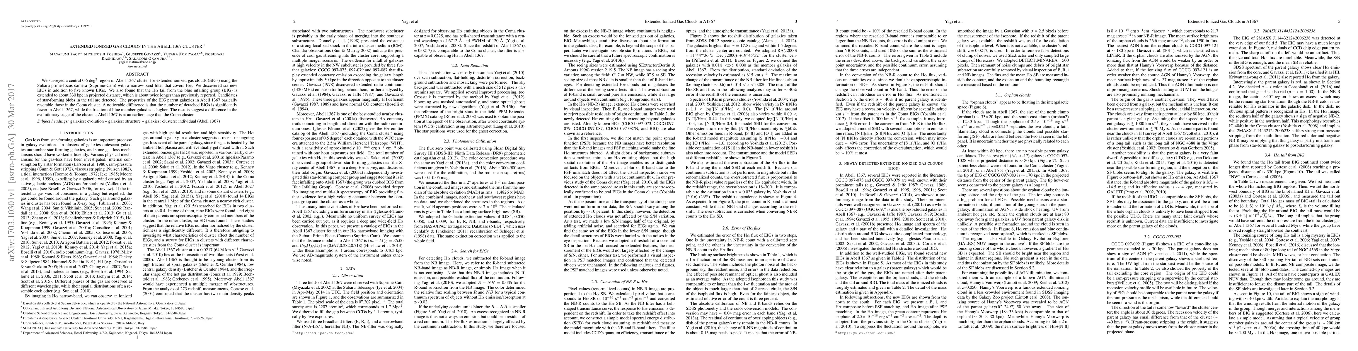 This paper reports the discovery of six new extended ionized gas clouds in the Abell 1367 cluster using Subaru's Suprime-Cam, revealing an extended Halpha tail from an infalling group. The findings suggest Abell 1367 is at an earlier evolutionary stage compared to the Coma cluster, with fewer detached ionized gas clouds and a higher fraction of blue member galaxies.