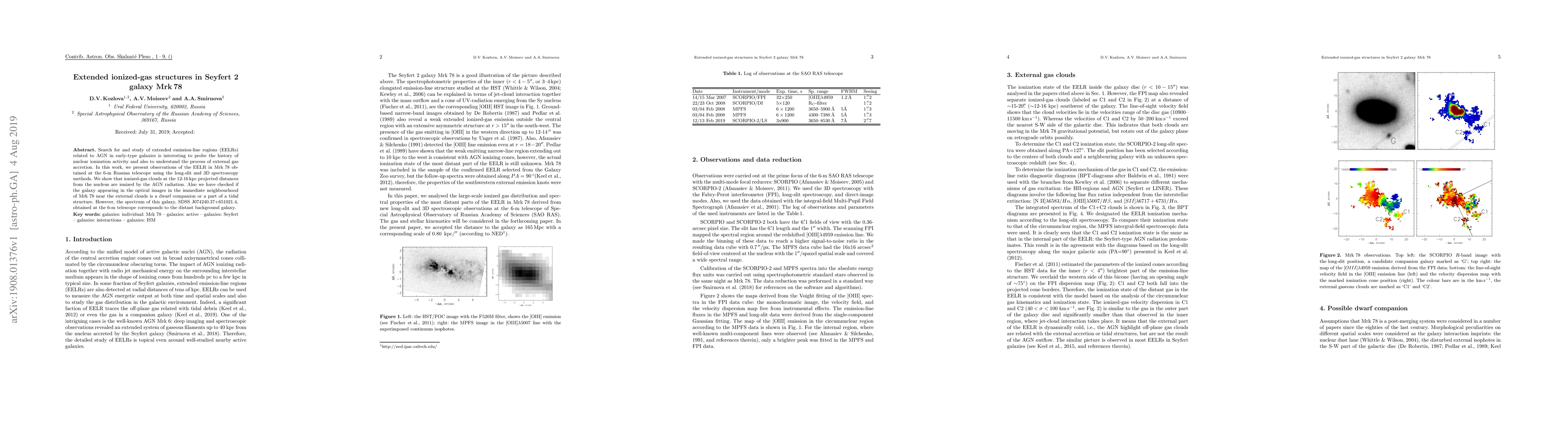 Search for and study of extended emission-line regions (EELRs) related to AGN in early-type galaxies is interesting to probe the history of nuclear ionization activity and also to understand the process of external gas accretion. In this work, we present observations of the EELR in Mrk 78 obtained at the 6-m Russian telescope using the long-slit and 3D spectroscopy methods. We show that ionized-gas clouds at the 12-16 kpc projected distances from the nucleus are ionized by the AGN radiation. Also we have checked if the galaxy appearing in the optical images in the immediate neighbourhood of Mrk 78 near the external clouds is a dwarf companion or a part of a tidal structure. However, the spectrum of this galaxy, SDSS J074240.37+651021.4, obtained at the 6-m telescope corresponds to the distant background galaxy.