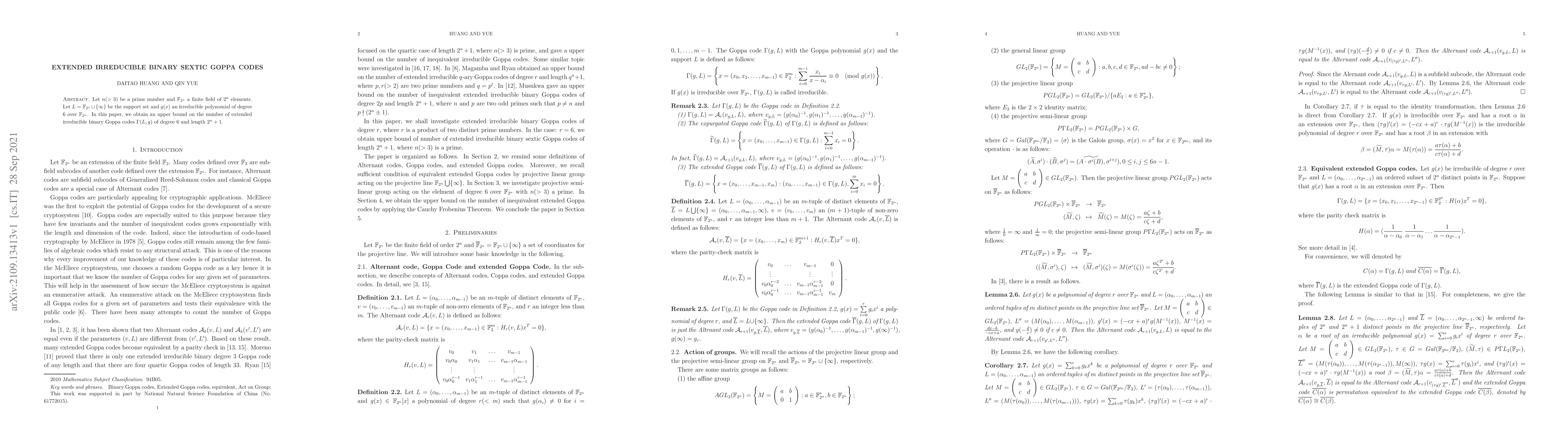 Let $n (>3)$ be a prime number and $\Bbb F_{2^n}$ a finite field of $2^n$ elements. Let $L =\Bbb F_{2^n}\cup \{\infty\}$ be the support set and $g(x)$ an irreducible polynomial of degree $6$ over $\Bbb F_{2^n}$. In this paper, we obtain an upper bound on the number of extended irreducible binary Goppa codes $\Gamma(L, g)$ of degree $6$ and length $2^n+1$.