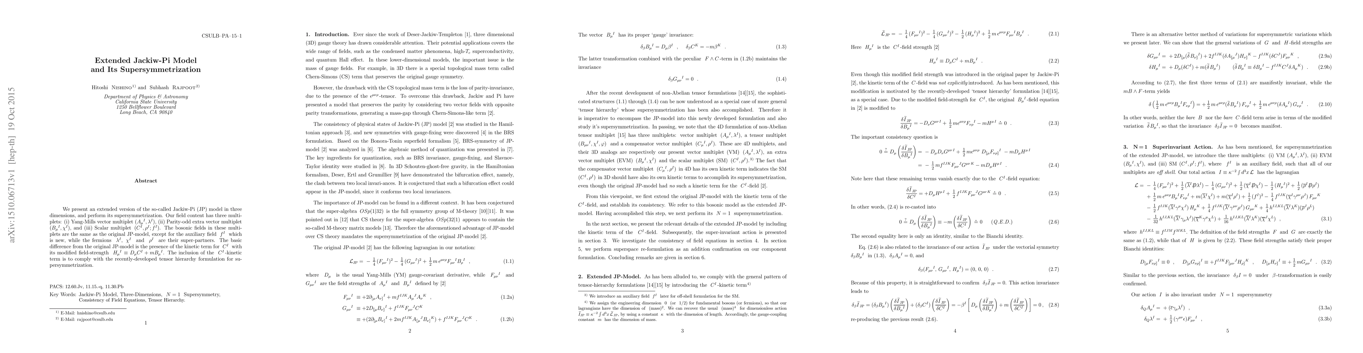 We present an extended version of the so-called Jackiw-Pi (JP) model in three dimensions, and perform its supersymmetrization. Our field content has three multiplets: (i) Yang-Mills vector multiplet $(A_\mu{}^I, \lambda^I)$, (ii) Parity-odd extra vector multiplet $(B_\mu{}^I, \chi^I)$, and (iii) Scalar multiplet $(C^I, \rho^I, f^I)$. The bosonic fields in these multiplets are the same as the original JP-model, except for the auxiliary field $~f^I$ which is new, while the fermions $\lambda^I, \chi^I$ and $\rho^I$ are their super-partners. The basic difference from the original JP-model is the presence of the kinetic term for $C^I$ with its modified field-strength $H_\mu{}^I \equiv D_\mu C^I + m B_\mu{}^I$. The inclusion of the $C^I$-kinetic term is to comply with the recently-developed tensor hierarchy formulation for supersymmetrization.