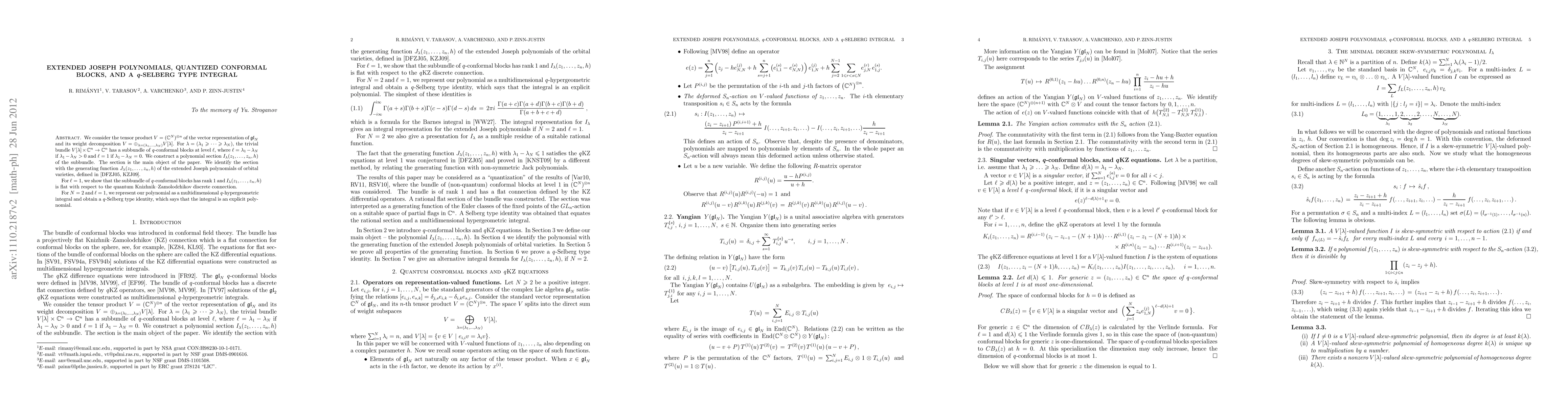 Researchers explore the connection between q-conformal blocks and extended Joseph polynomials, showing that a specific polynomial section is related to generating functions for these objects and obtaining a q-Selberg type identity in a 2D case.
