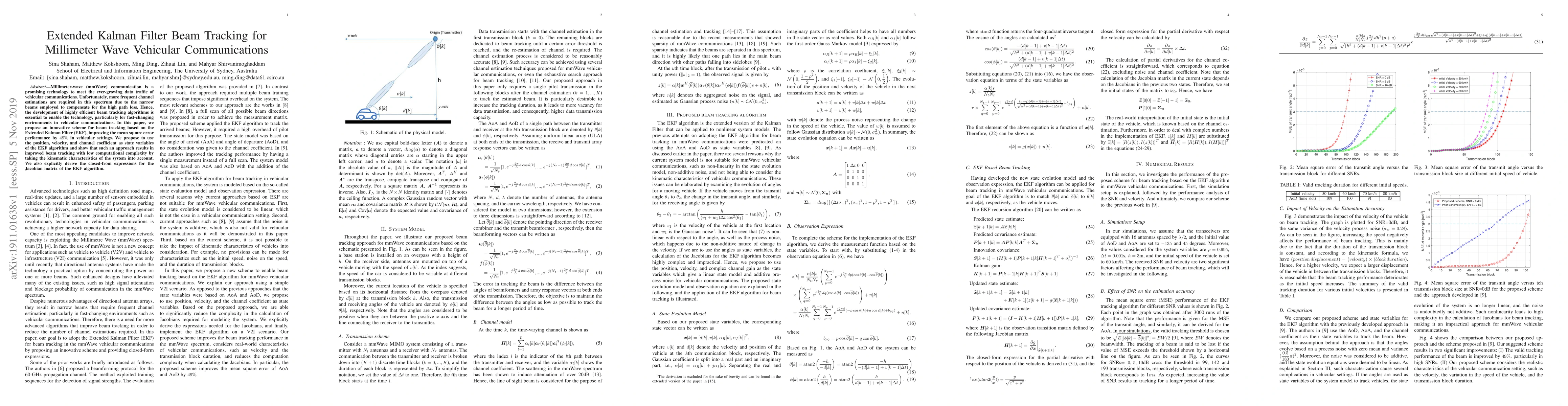 The paper proposes an Extended Kalman Filter (EKF) based beam tracking scheme for millimeter wave vehicular communications, using position, velocity, and channel coefficients as state variables.
