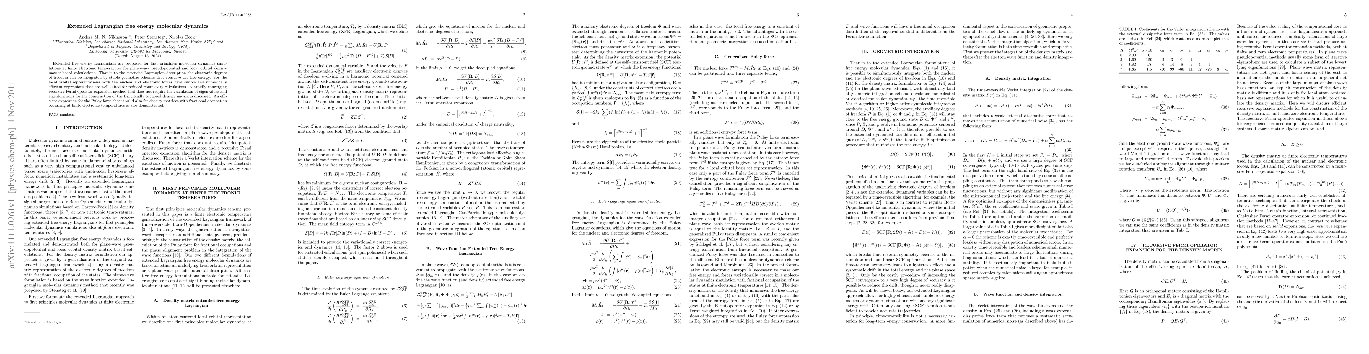 This paper proposes extended free energy Lagrangians for molecular dynamics at finite electronic temperatures, enabling stable integration of electronic degrees of freedom. It introduces efficient expressions for nuclear and electronic forces in local orbital representations, along with a recursive method for constructing fractionally occupied density matrices without eigenvalue calculations.