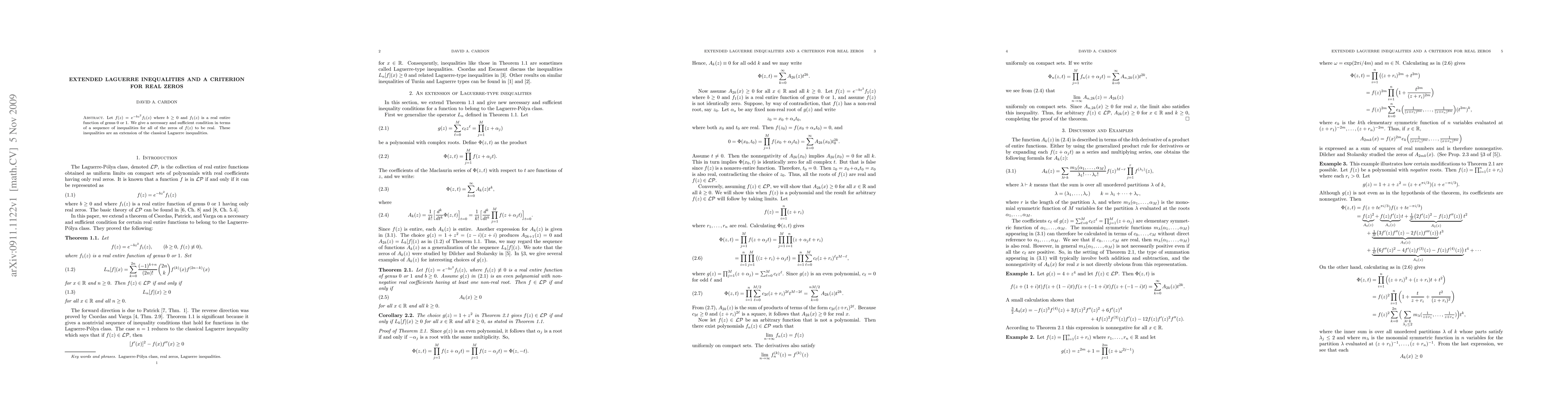 The paper establishes a necessary and sufficient condition for the realness of all zeros of a function $f(z)=e^{-bz^2}f_1(z)$, where $b \geq 0$ and $f_1(z)$ is a real entire function. The condition is derived through extended Laguerre inequalities.