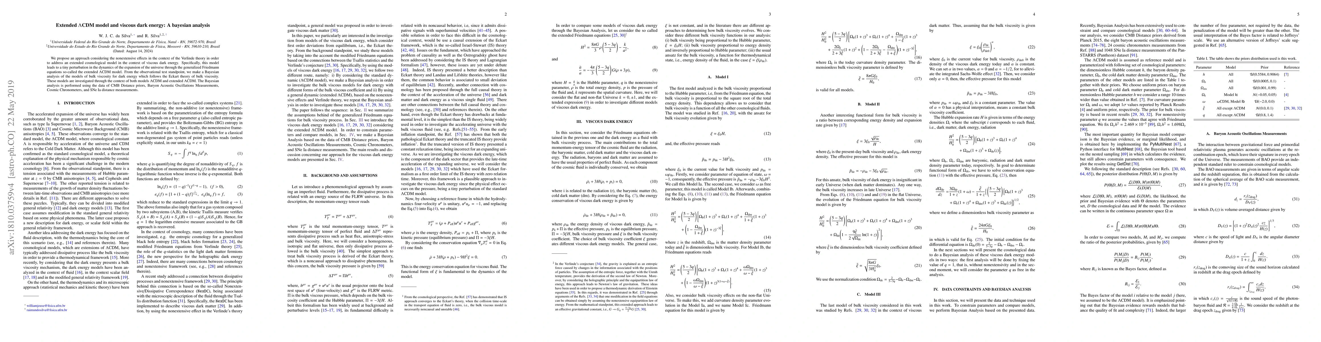 This paper proposes an extended $\Lambda$CDM model incorporating viscous dark energy and nonextensive effects from Verlinde theory. It conducts a Bayesian analysis comparing models with bulk viscosity, using observational data from CMB, BAO, cosmic chronometers, and SNe Ia to test the extended $\Lambda$CDM model against the standard $\Lambda$CDM model.