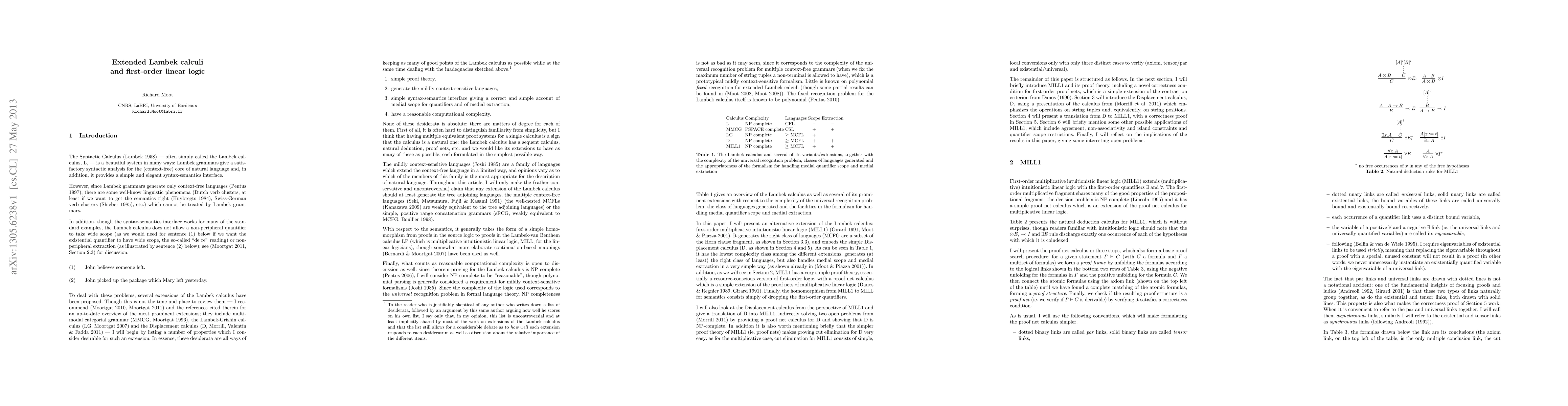 The paper presents a first-order extension of the Lambek calculus, MILL1, and demonstrates its equivalence to multiple context-free languages and the Displacement calculus.