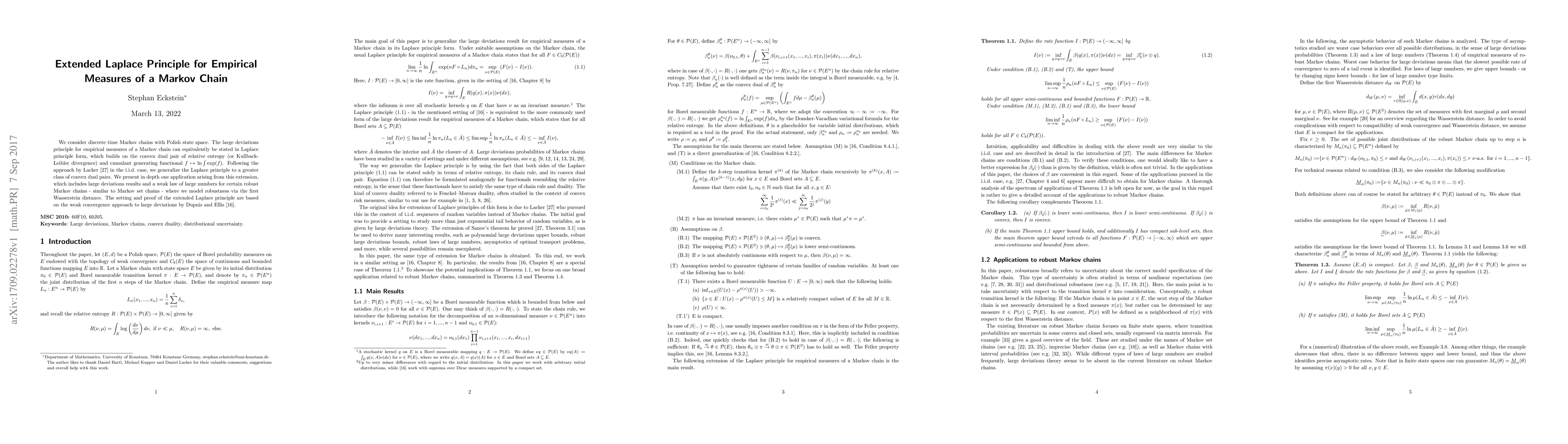 This paper extends the Laplace principle for empirical measures of Markov chains to a broader class of convex dual pairs, generalizing the approach used for i.i.d. cases. An application of this extension includes large deviations results and a weak law of large numbers for robust Markov chains modeled via the first Wasserstein distance.