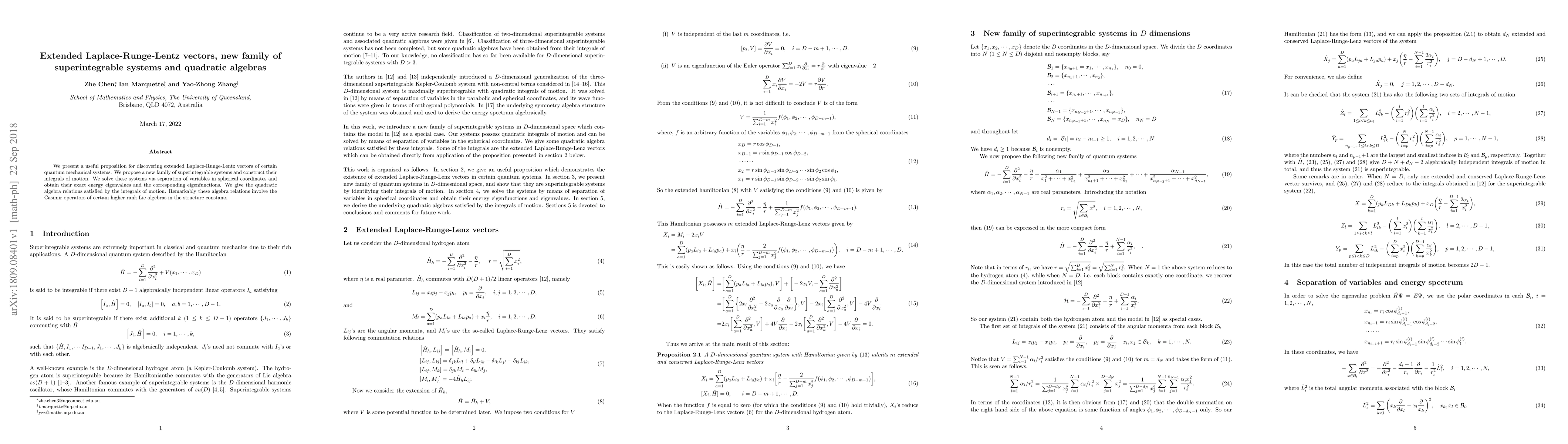 This paper introduces extended Laplace-Runge-Lentz vectors for quantum mechanical systems, proposes a new family of superintegrable systems, and constructs their integrals of motion. The systems are solved via separation of variables in spherical coordinates, yielding exact energy eigenvalues and eigenfunctions, and the quadratic algebra relations involve the Casimir operators of higher rank Lie algebras.