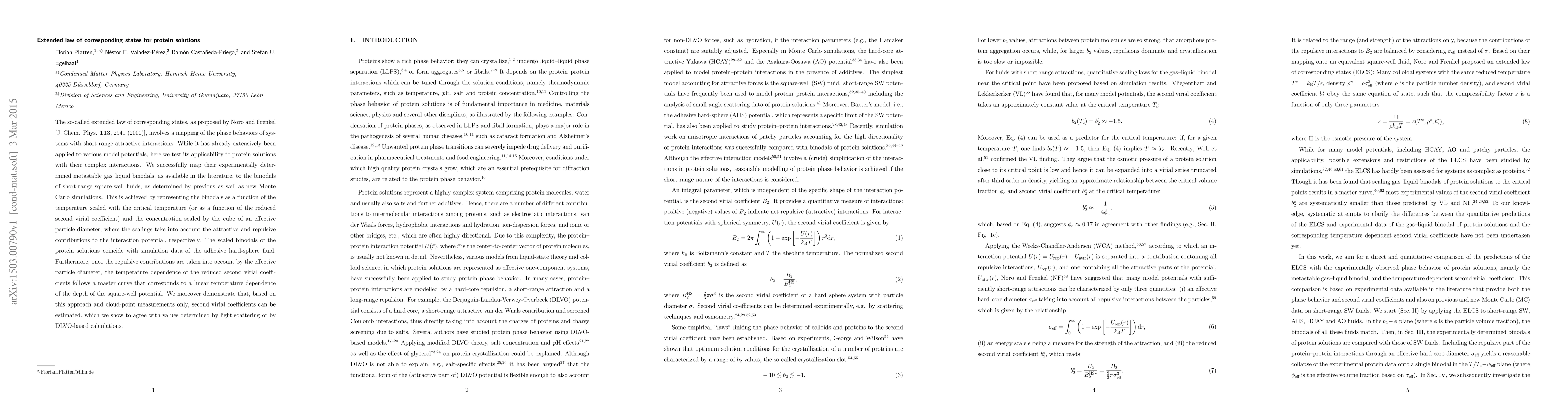 The so-called extended law of corresponding states, as proposed by Noro and Frenkel [J. Chem. Phys. 113, 2941 (2000)], involves a mapping of the phase behaviors of systems with short-range attractive interactions. While it has already extensively been applied to various model potentials, here we test its applicability to protein solutions with their complex interactions. We successfully map their experimentally determined metastable gas--liquid binodals, as available in the literature, to the binodals of short-range square-well fluids, as determined by previous as well as new Monte Carlo simulations. This is achieved by representing the binodals as a function of the temperature scaled with the critical temperature (or as a function of the reduced second virial coefficient) and the concentration scaled by the cube of an effective particle diameter, where the scalings take into account the attractive and repulsive contributions to the interaction potential, respectively. The scaled binodals of the protein solutions coincide with simulation data of the adhesive hard-sphere fluid. Furthermore, once the repulsive contributions are taken into account by the effective particle diameter, the temperature dependence of the reduced second virial coefficients follows a master curve that corresponds to a linear temperature dependence of the depth of the square-well potential. We moreover demonstrate that, based on this approach and cloud-point measurements only, second virial coefficients can be estimated, which we show to agree with values determined by light scattering or by DLVO-based calculations.