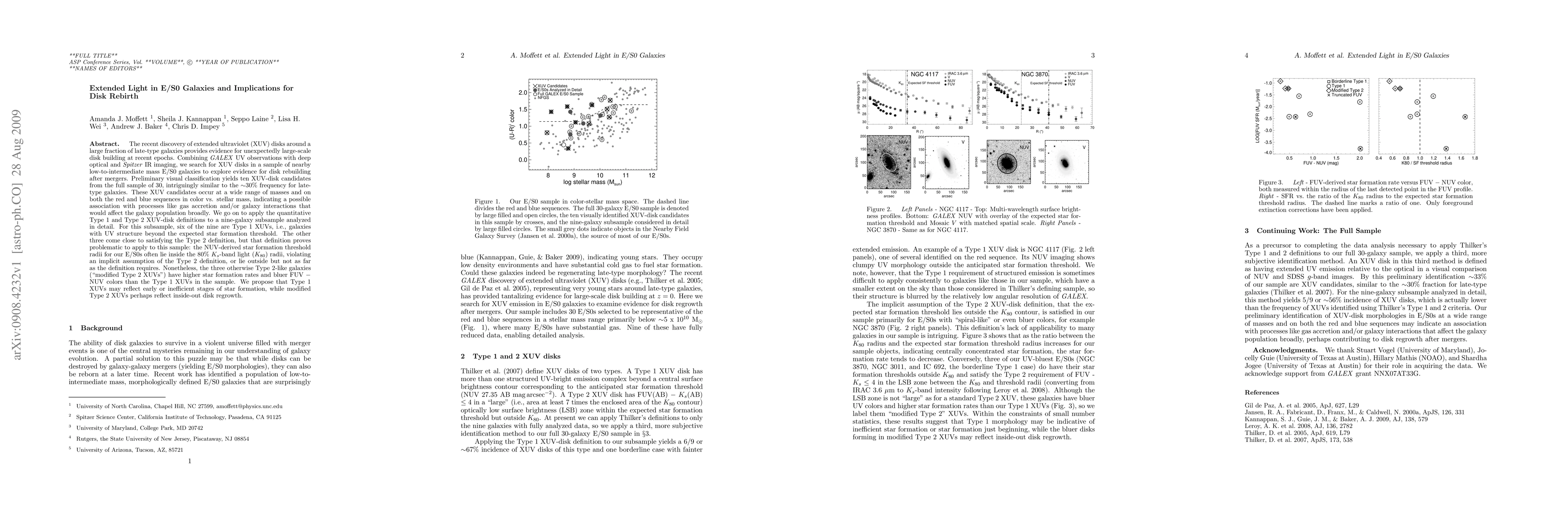 This paper investigates extended ultraviolet (XUV) disks in nearby E/S0 galaxies, finding evidence for disk rebuilding after mergers. Ten XUV-disk candidates from a sample of 30 galaxies suggest a frequency similar to late-type galaxies, indicating processes like gas accretion and interactions. Detailed analysis of a subsample reveals six Type 1 XUVs and three modified Type 2 XUVs, suggesting early star formation stages and potential inside-out disk regrowth, respectively.