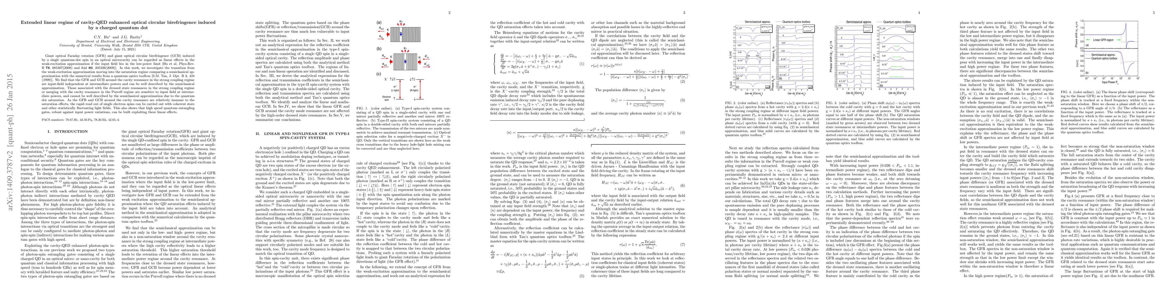 Giant optical Faraday rotation (GFR) and giant optical circular birefringence (GCB) induced by a single quantum-dot spin in an optical microcavity can be regarded as linear effects in the weak-excitation approximation if the input field lies in the low-power limit [Hu et al, Phys.Rev. B {\bf 78}, 085307(2008) and ibid {\bf 80}, 205326(2009)]. In this work, we investigate the transition from the weak-excitation approximation moving into the saturation regime comparing a semiclassical approximation with the numerical results from a quantum optics toolbox [S.M. Tan, J. Opt. B {\bf 1}, 424 (1999)]. We find that the GFR and GCB around the cavity resonance in the strong coupling regime are input-field independent at intermediate powers and can be well described by the semiclassical approximation. Those associated with the dressed state resonances in the strong coupling regime or merging with the cavity resonance in the Purcell regime are sensitive to input field at intermediate powers, and cannot be well described by the semiclassical approximation due to the quantum dot saturation. As the GFR and GCB around the cavity resonance are relatively immune to the saturation effects, the rapid read out of single electron spins can be carried out with coherent state and other statistically fluctuating light fields. This also shows that high speed quantum entangling gates, robust against input power variations, can be built exploiting these linear effects.