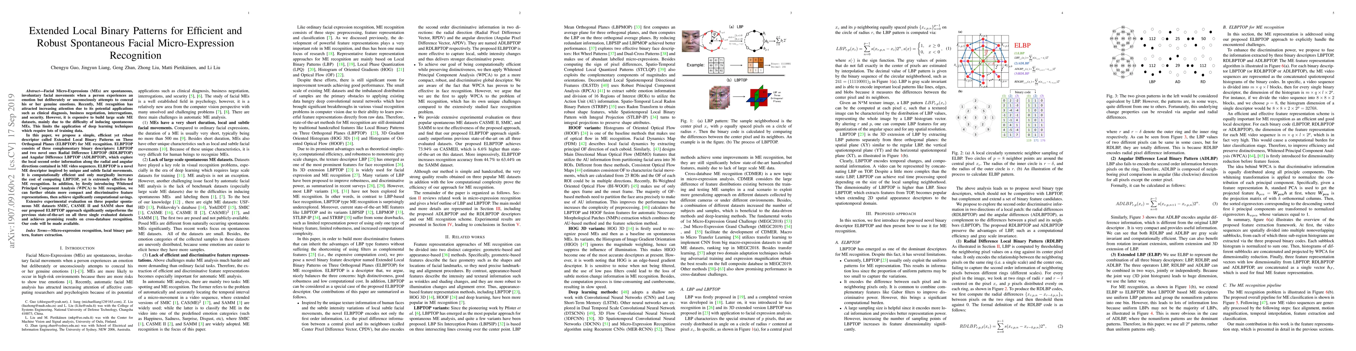 This paper proposes Extended Local Binary Patterns on Three Orthogonal Planes (ELBPTOP) for efficient and robust recognition of spontaneous facial micro-expressions. It combines LBPTOP with novel Radial and Angular Difference LBPTOP descriptors, and introduces Whitened Principal Component Analysis to enhance feature compactness, achieving superior performance over previous methods on multiple datasets.