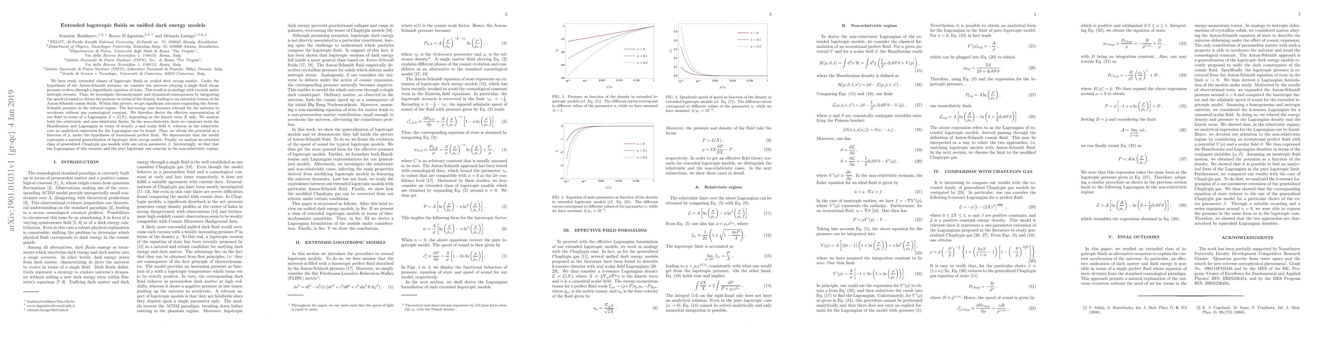 We here study extended classes of logotropic fluids as \textit{unified dark energy models}. Under the hypothesis of the Anton-Schmidt scenario, we consider the universe obeying a single fluid whose pressure evolves through a logarithmic equation of state. This result is in analogy with crystals under isotropic stresses. Thus, we investigate thermodynamic and dynamical consequences by integrating the speed of sound to obtain the pressure in terms of the density, leading to an extended version of the Anton-Schmidt cosmic fluids. Within this picture, we get significant outcomes expanding the Anton-Schmidt pressure in the infrared regime. The low-energy case becomes relevant for the universe to accelerate without any cosmological constant. We therefore derive the effective representation of our fluid in terms of a Lagrangian $\mathcal{L}=\mathcal{L}(X)$, depending on the kinetic term $X$ only. We analyze both the relativistic and non-relativistic limits. In the non-relativistic limit we construct both the Hamiltonian and Lagrangian in terms of density $\rho$ and scalar field $\vartheta$, whereas in the relativistic case no analytical expression for the Lagrangian can be found. Thus, we obtain the potential as a function of $\rho$, under the hypothesis of irrotational perfect fluid. We demonstrate that the model represents a natural generalization of \emph{logotropic dark energy models}. Finally, we analyze an extended class of generalized Chaplygin gas models with one extra parameter $\beta$. Interestingly, we find that the Lagrangians of this scenario and the pure logotropic one coincide in the non-relativistic regime.