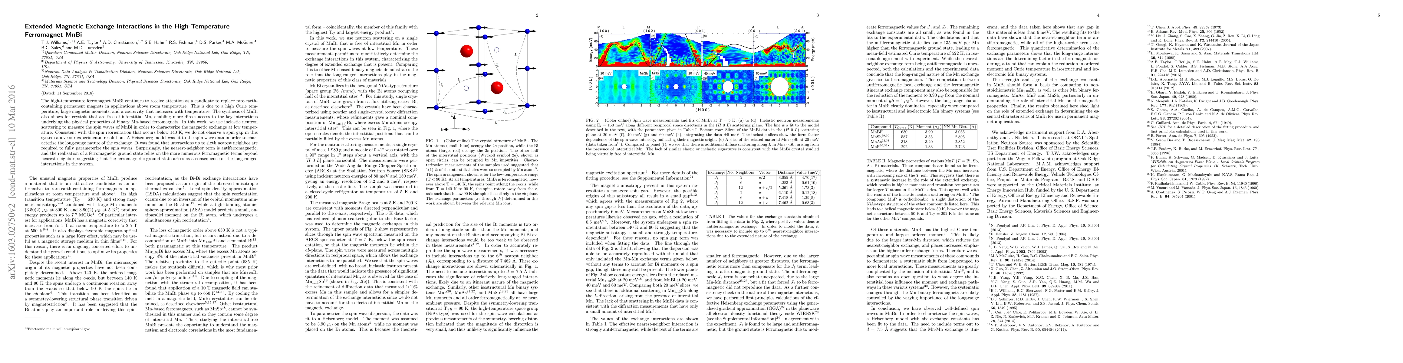 This study investigates the magnetic exchange interactions in the high-temperature ferromagnet MnBi using inelastic neutron scattering. The findings reveal that long-range interactions beyond nearest neighbors are crucial for the ferromagnetic ground state, with the nearest-neighbor interaction being antiferromagnetic.