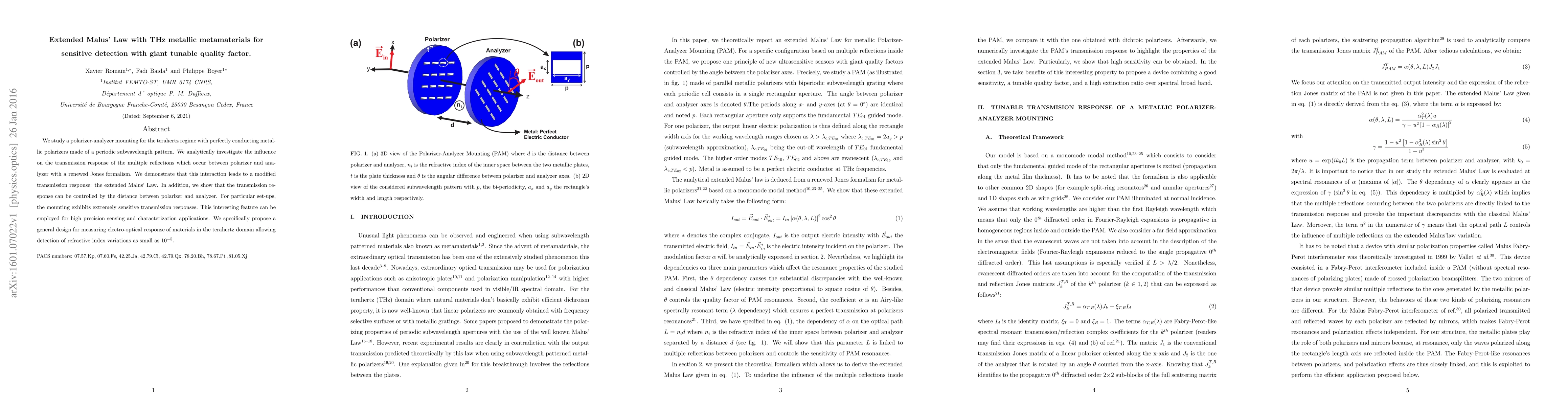 We study a polarizer-analyzer mounting for the terahertz regime with perfectly conducting metallic polarizers made of a periodic subwavelength pattern. We analytically investigate the influence on the transmission response of the multiple reflections which occur between polarizer and analyzer with a renewed Jones formalism. We demonstrate that this interaction leads to a modified transmission response: the extended Malus' Law. In addition, we show that the transmission response can be controlled by the distance between polarizer and analyzer. For particular set-ups, the mounting exhibits extremely sensitive transmission responses. This interesting feature can be employed for high precision sensing and characterization applications. We specifically propose a general design for measuring electro-optical response of materials in the terahertz domain allowing detection of refractive index variations as small as $10^{-5}$.