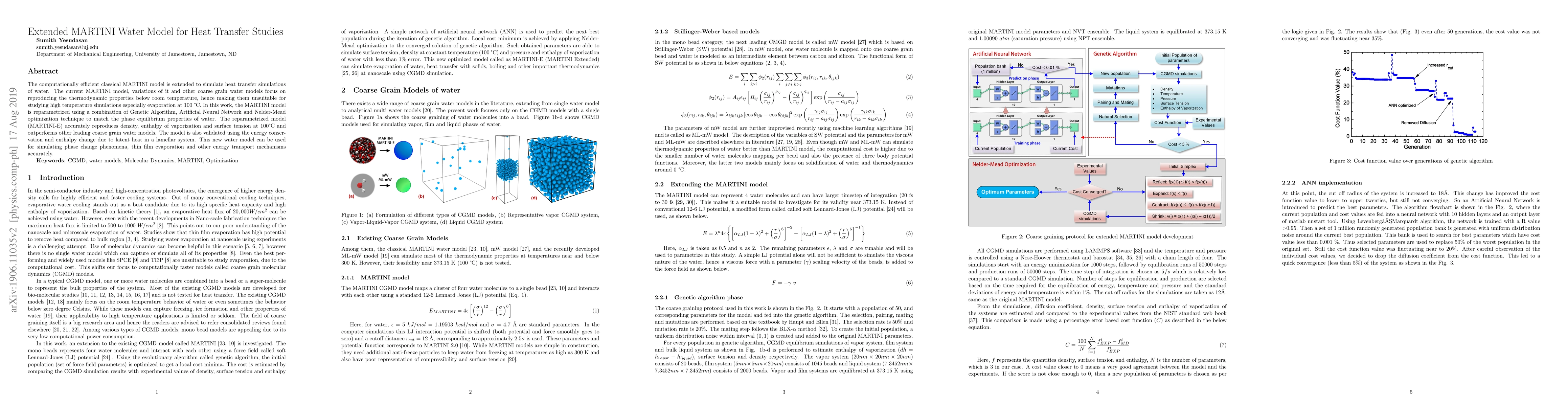 The computationally efficient classical MARTINI model is extended to simulate heat transfer simulations of water. The current MARTINI model, variations of it and other coarse grain water models focus on reproducing the thermodynamic properties below room temperature, hence making them unsuitable for studying high temperature simulations especially evaporation at 100 {\deg}C. In this work, the MARTINI model is reparametrized using a combination of Genetic Algorithm, Artificial Neural Network and Nelder-Mead optimization technique to match the phase equilibrium properties of water. The reparametrized model (MARTINI-E) accurately reproduces density, enthalpy of vaporization and surface tension at 100{\deg}C and outperforms other leading coarse grain water models. The model is also validated using the energy conservation and enthalpy change due to latent heat in a lamellar system. This new water model can be used for simulating phase change phenomena, thin film evaporation and other energy transport mechanisms accurately.