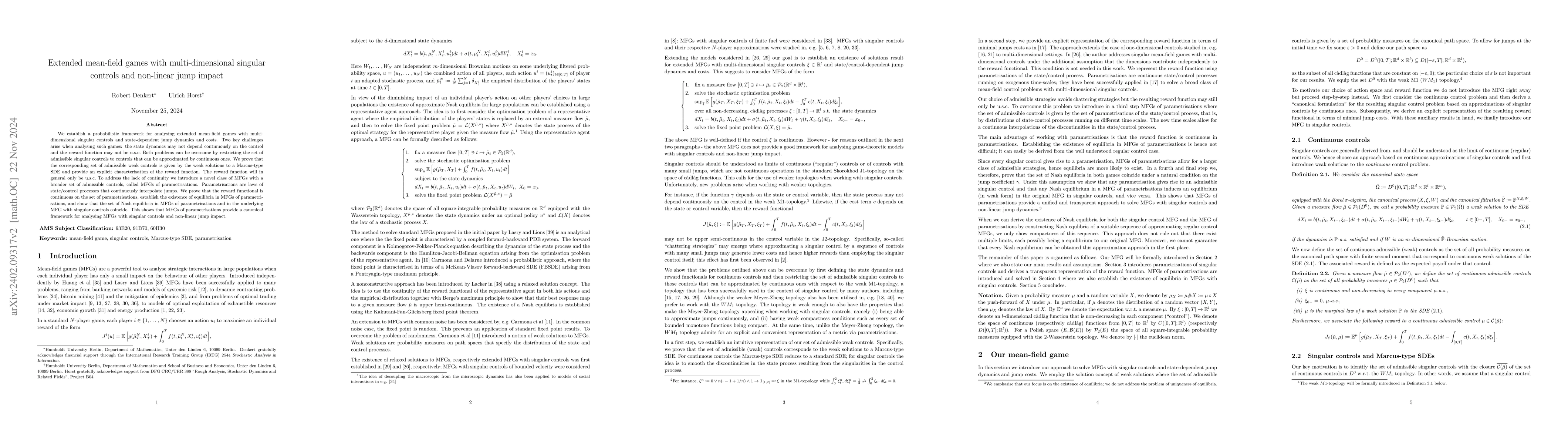 We establish a probabilistic framework for analysing extended mean-field games with multi-dimensional singular controls and state-dependent jump dynamics and costs. Two key challenges arise when analysing such games: the state dynamics may not depend continuously on the control and the reward function may not be u.s.c.~Both problems can be overcome by restricting the set of admissible singular controls to controls that can be approximated by continuous ones. We prove that the corresponding set of admissible weak controls is given by the weak solutions to a Marcus-type SDE and provide an explicit characterisation of the reward function. The reward function will in general only be u.s.c.~To address the lack of continuity we introduce a novel class of MFGs with a broader set of admissible controls, called MFGs of parametrisations. Parametrisations are laws of state/control processes that continuously interpolate jumps. We prove that the reward functional is continuous on the set of parametrisations, establish the existence of equilibria in MFGs of parametrisations, and show that the set of Nash equilibria in MFGs of parametrisations and in the underlying MFG with singular controls coincide. This shows that MFGs of parametrisations provide a canonical framework for analysing MFGs with singular controls and non-linear jump impact.