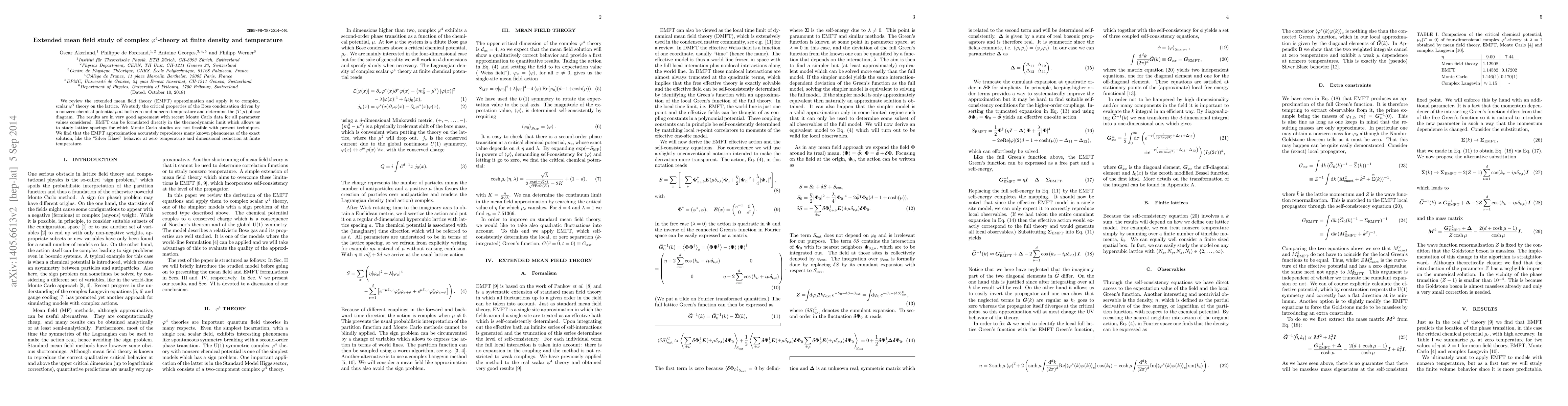 We review the Extended Mean Field Theory (EMFT) approximation and apply it to complex, scalar $\phi^4$-theory on the lattice. We study the critical properties of the Bose condensation driven by a nonzero chemical potential $\mu$ at both zero and nonzero temperature and determine the $(T,\mu)$ phase diagram. The results are in very good agreement with recent Monte Carlo data for all parameter values considered. EMFT can be formulated directly in the thermodynamic limit which allows us to study lattice spacings for which Monte Carlo studies are not feasible with present techniques. We find that the EMFT approximation accurately reproduces many known phenomena of the exact solution, like the "Silver Blaze" behavior at zero temperature and dimensional reduction at finite temperature.