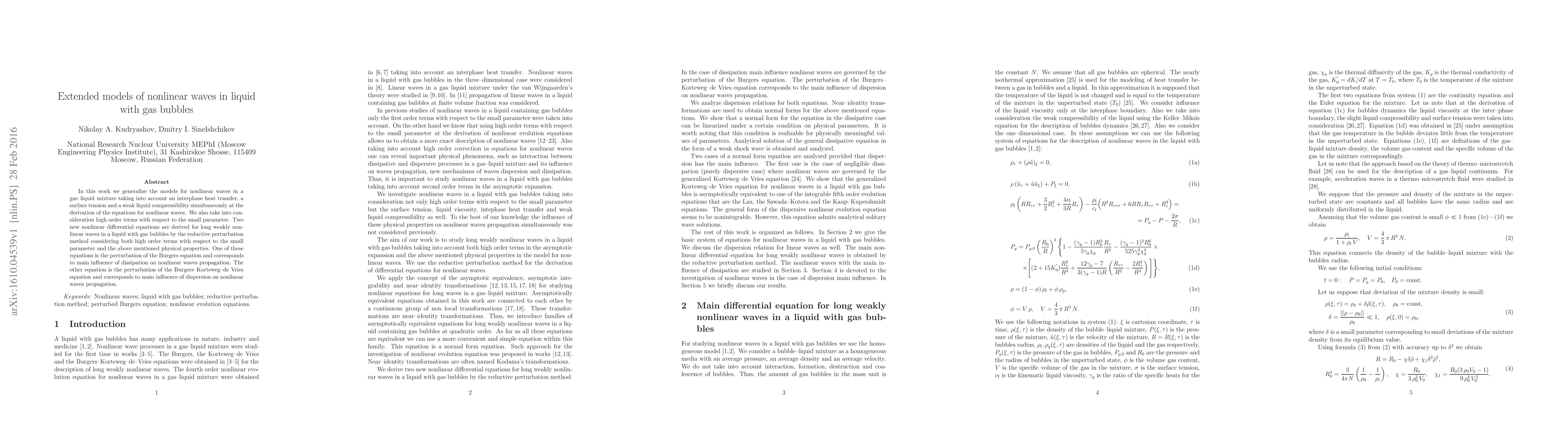 This paper generalizes models for nonlinear waves in gas-liquid mixtures, incorporating interphase heat transfer, surface tension, and weak liquid compressibility. Two new nonlinear differential equations are derived for long weakly nonlinear waves, one influenced mainly by dissipation and the other by dispersion.