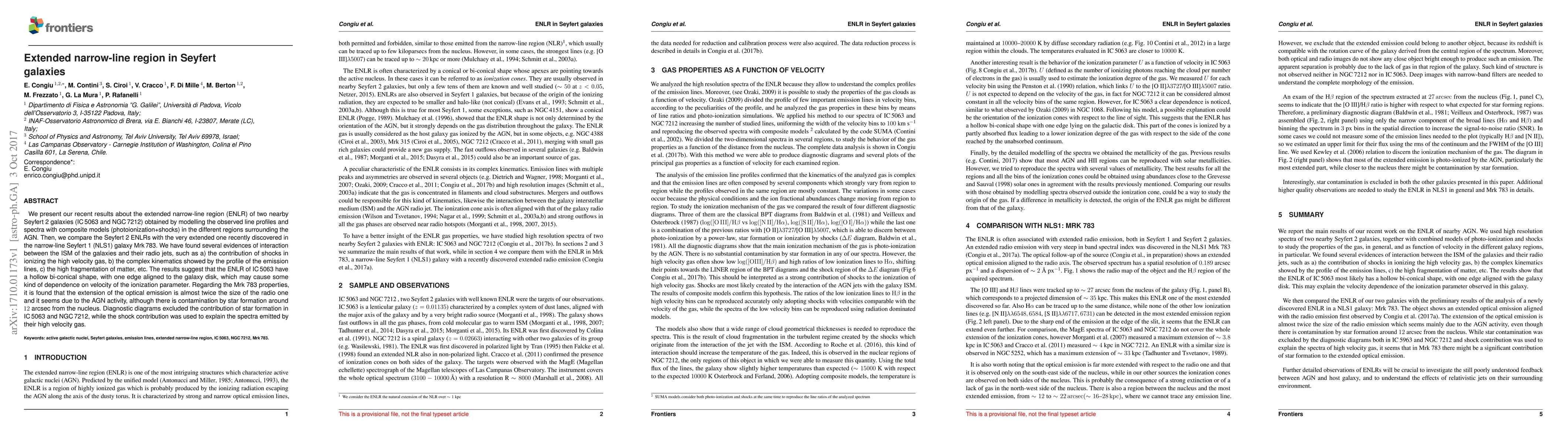 This study explores the extended narrow-line regions (ENLRs) of Seyfert 2 galaxies IC 5063 and NGC 7212, revealing bi-conical shapes with one edge aligned to the galaxy disk, likely influenced by AGN activity. The research also compares these ENLRs with the very extended ENLR in narrow-line Seyfert 1 (NLS1) galaxy Mrk 783, finding evidence of interaction between galactic ISM and radio jets in all cases. The methodology involved modeling observed line profiles and spectra with composite photoionization and shock models. The findings suggest shocks contribute to ionizing high-velocity gas, while diagnostic diagrams exclude significant star formation contributions.