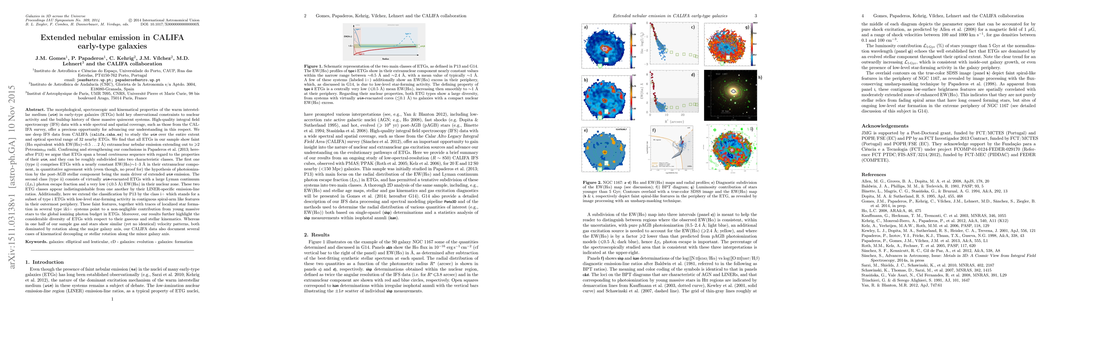 This paper uses CALIFA survey data to study the warm interstellar medium in early-type galaxies, revealing faint extranuclear nebular emission extending beyond 2 radii in all galaxies. The study identifies two classes of ETGs based on their warm interstellar medium properties, with a third subset showing low-level star formation in outer regions.