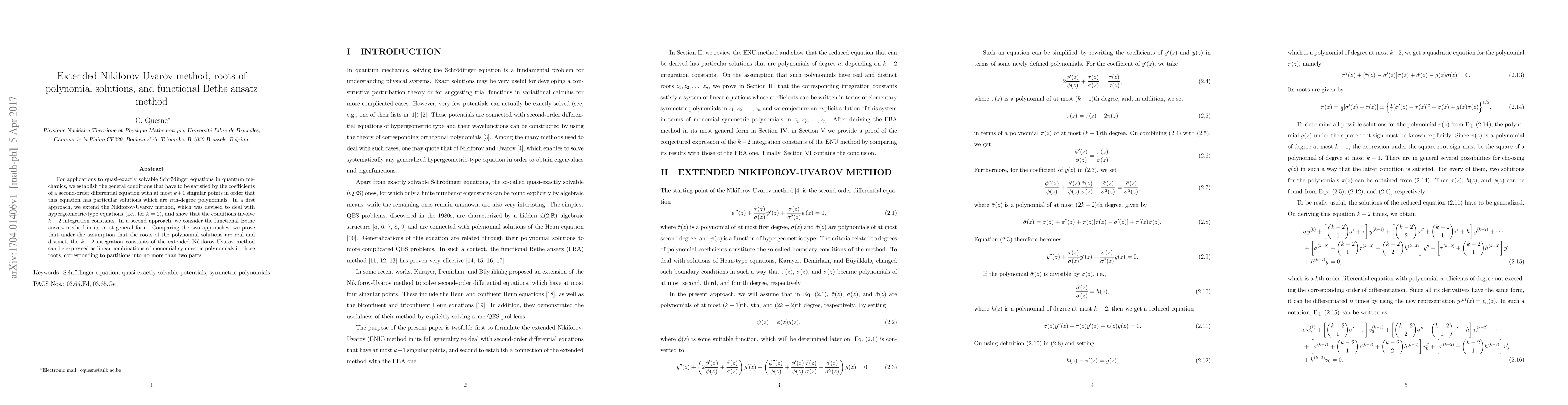 For applications to quasi-exactly solvable Schr\"odinger equations in quantum mechanics, we establish the general conditions that have to be satisfied by the coefficients of a second-order differential equation with at most $k+1$ singular points in order that this equation has particular solutions which are $n$th-degree polynomials. In a first approach, we extend the Nikiforov-Uvarov method, which was devised to deal with hypergeometric-type equations (i.e., for $k=2$), and show that the conditions involve $k-2$ integration constants. In a second approach, we consider the functional Bethe ansatz method in its most general form. Comparing the two approaches, we prove that under the assumption that the roots of the polynomial solutions are real and distinct, the $k-2$ integration constants of the extended Nikiforov-Uvarov method can be expressed as linear combinations of monomial symmetric polynomials in those roots, corresponding to partitions into no more than two parts.