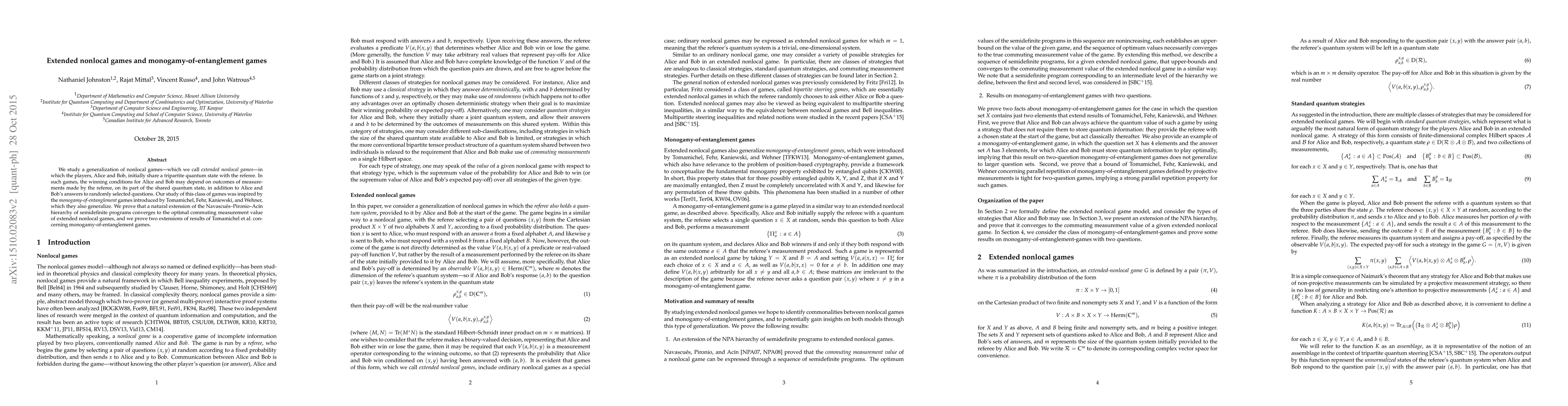 We study a generalization of nonlocal games---which we call extended nonlocal games---in which the players, Alice and Bob, initially share a tripartite quantum state with the referee. In such games, the winning conditions for Alice and Bob may depend on outcomes of measurements made by the referee, on its part of the shared quantum state, in addition to Alice and Bob's answers to randomly selected questions. Our study of this class of games was inspired by the monogamy-of-entanglement games introduced by Tomamichel, Fehr, Kaniewski, and Wehner, which they also generalize. We prove that a natural extension of the Navascues--Pironio--Acin hierarchy of semidefinite programs converges to the optimal commuting operator value of extended nonlocal games, and we prove two extensions of results of Tomamichel et al. concerning monogamy-of-entanglement games.