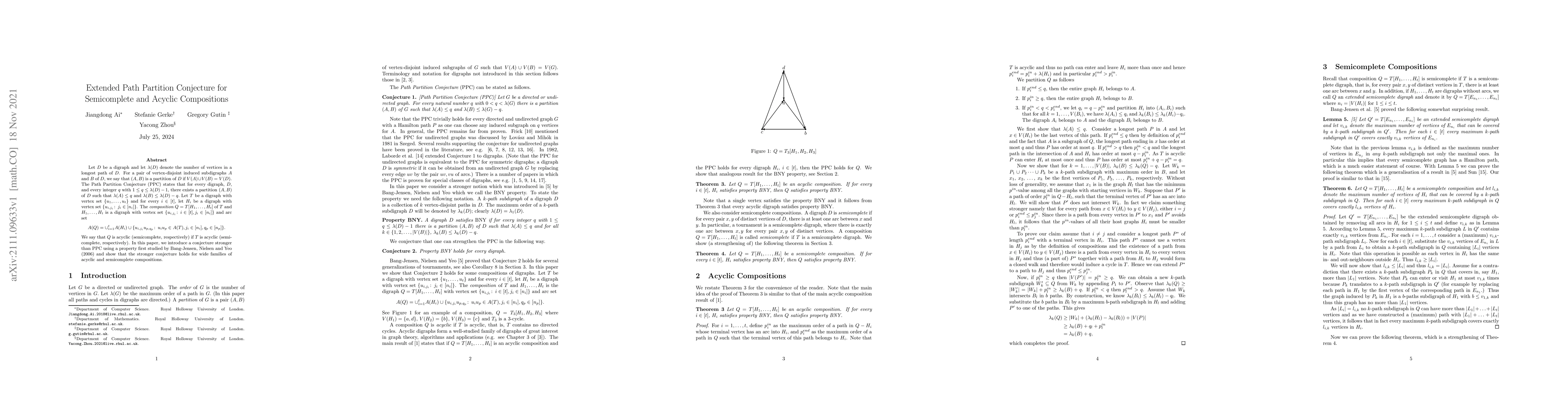 Let $D$ be a digraph and let $\lambda(D)$ denote the number of vertices in a longest path of $D$. For a pair of vertex-disjoint induced subdigraphs $A$ and $B$ of $D$, we say that $(A,B)$ is a partition of $D$ if $V(A)\cup V(B)=V(D).$ The Path Partition Conjecture (PPC) states that for every digraph, $D$, and every integer $q$ with $1\leq q\leq\lambda(D)-1$, there exists a partition $(A,B)$ of $D$ such that $\lambda(A)\leq q$ and $\lambda(B)\leq\lambda(D)-q.$ Let $T$ be a digraph with vertex set $\{u_1,\dots, u_t\}$ and for every $i\in [t]$, let $H_i$ be a digraph with vertex set $\{u_{i,j_i}\colon\, j_i\in [n_i]\}$. The {\em composition} $Q=T[H_1,\dots , H_t]$ of $T$ and $H_1,\ldots, H_t$ is a digraph with vertex set $\{u_{i,j_i}\colon\, i\in [t], j_i\in [n_i]\}$ and arc set $$A(Q)=\cup^t_{i=1}A(H_i)\cup \{u_{i,j_i}u_{p,q_p}\colon\, u_iu_p\in A(T), j_i\in [n_i], q_p\in [n_p]\}.$$ We say that $Q$ is acyclic {(semicomplete, respectively)} if $T$ is acyclic {(semicomplete, respectively)}. In this paper, we introduce a conjecture stronger than PPC using a property first studied by Bang-Jensen, Nielsen and Yeo (2006) and show that the stronger conjecture holds for wide families of acyclic and semicomplete compositions.