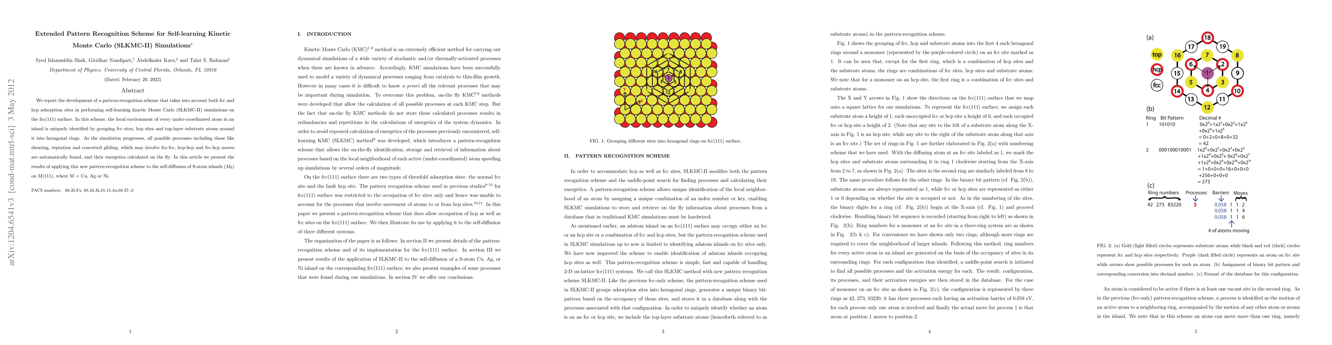 We report the development of a pattern-recognition scheme that takes into account both fcc and hcp adsorption sites in performing self-learning kinetic Monte Carlo (SLKMC-II) simulations on the fcc(111) surface. In this scheme, the local environment of every under-coordinated atom in an island is uniquely identified by grouping fcc sites, hcp sites and top-layer substrate atoms around it into hexagonal rings. As the simulation progresses, all possible processes including those like shearing, reptation and concerted gliding, which may involve fcc-fcc, hcp-hcp and fcc-hcp moves are automatically found, and their energetics calculated on the fly. In this article we present the results of applying this new pattern-recognition scheme to the self-diffusion of 9-atom islands (M9) on M(111), where M = Cu, Ag or Ni.