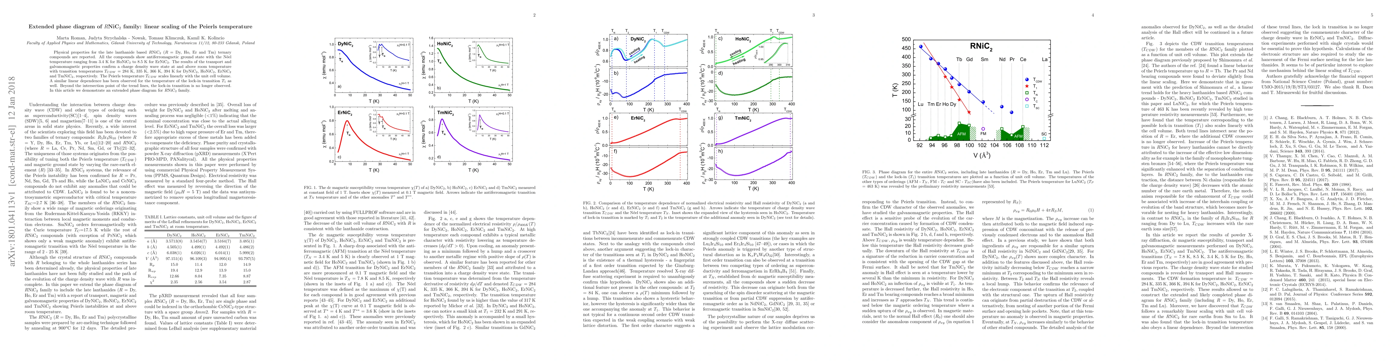 Physical properties for the late-lanthanide-based RNiC2 (R = Dy, Ho, Er, and Tm) ternary compounds are reported. All the compounds show antiferromagnetic ground state with the N\'eel temperature ranging from 3.4 K for HoNiC2 to 8.5 K for ErNiC2. The results of the transport and galvanomagnetic properties confirm a charge density wave state at and above room temperature with transition temperatures TCDW = 284, 335, 366, and 394 K for DyNiC2, HoNiC2, ErNiC2, and TmNiC2, respectively. The Peierls temperature TCDW scales linearly with the unit cell volume. A similar linear dependence has been observed for the temperature of the lock-in transition T1 as well. Beyond the intersection point of the trend lines, the lock-in transition is no longer observed. In this Rapid Communication we demonstrate an extended phase diagram for the RNiC2 family.