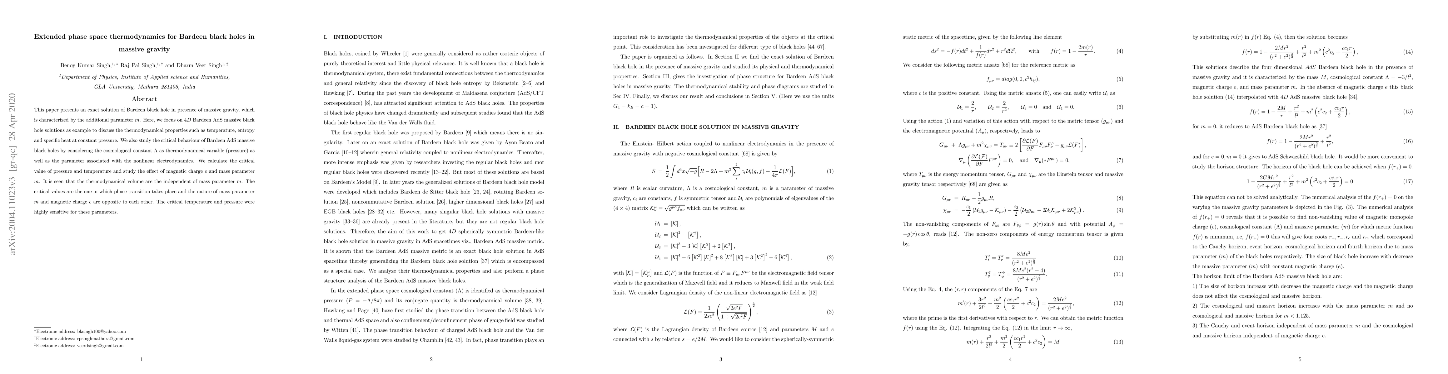 This research examines Bardeen black holes within massive gravity, deriving exact solutions and analyzing their thermodynamic properties like temperature, entropy, and specific heat at constant pressure. It explores critical behavior, considering cosmological constant and NL electrodynamics parameters, finding that thermodynamic volume is independent of mass parameter m, but critical temperature and pressure are sensitive to both m and magnetic charge e, whose effects oppose each other.