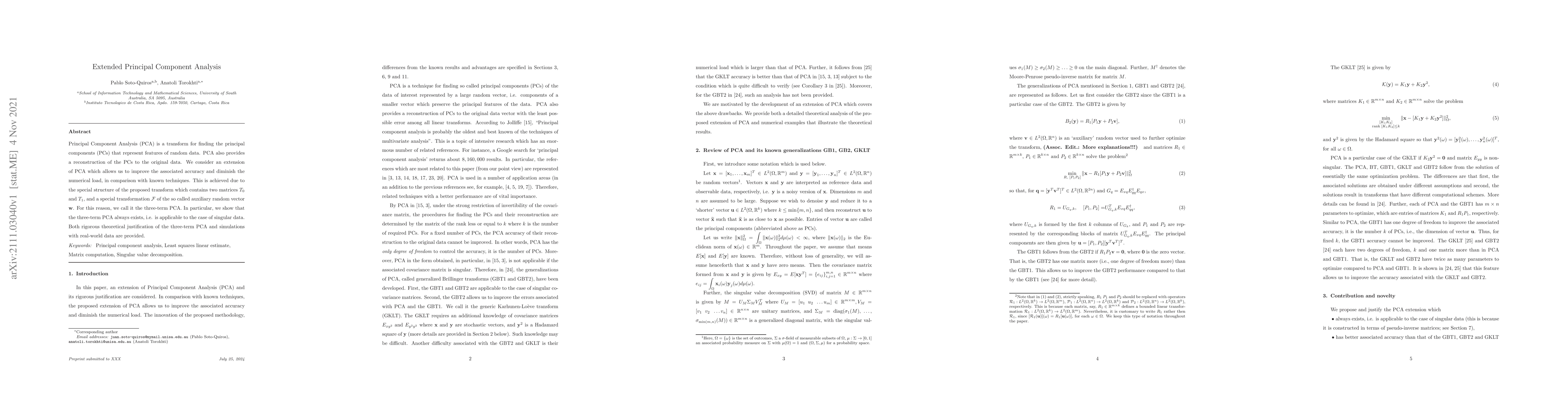 Principal Component Analysis (PCA) is a transform for finding the principal components (PCs) that represent features of random data. PCA also provides a reconstruction of the PCs to the original data. We consider an extension of PCA which allows us to improve the associated accuracy and diminish the numerical load, in comparison with known techniques. This is achieved due to the special structure of the proposed transform which contains two matrices $T_0$ and $T_1$, and a special transformation $\mathcal{f}$ of the so called auxiliary random vector $\mathbf w$. For this reason, we call it the three-term PCA. In particular, we show that the three-term PCA always exists, i.e. is applicable to the case of singular data. Both rigorous theoretical justification of the three-term PCA and simulations with real-world data are provided.