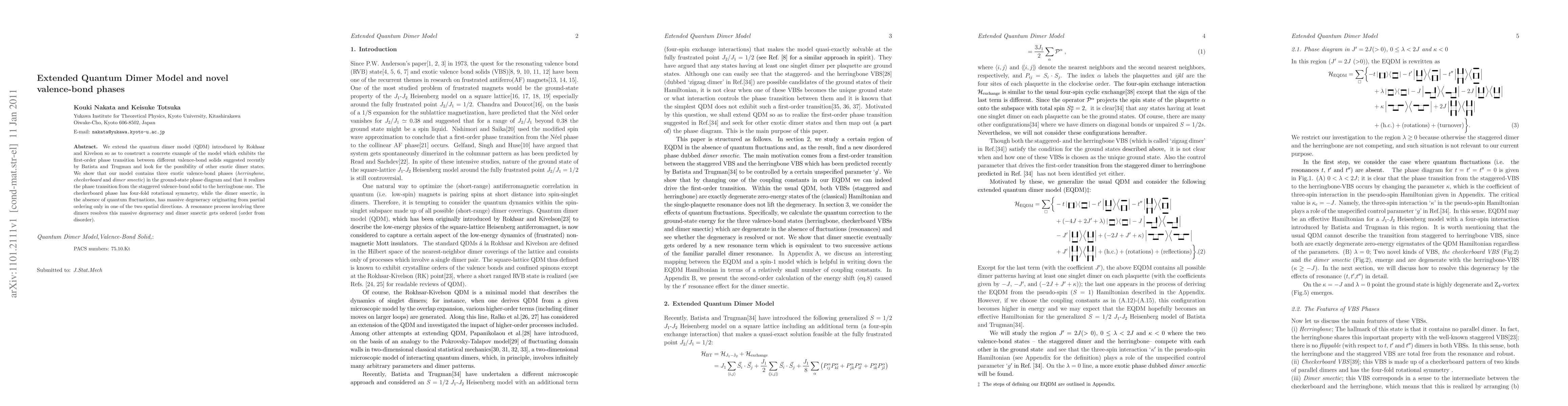 This paper extends the quantum dimer model to demonstrate a first-order phase transition between different valence-bond solids, revealing three exotic phases: herringbone, checkerboard, and dimer smectic. The model shows a transition from staggered valence-bond solid to herringbone, with the dimer smectic phase resolving its massive degeneracy through a resonance process involving three dimers.