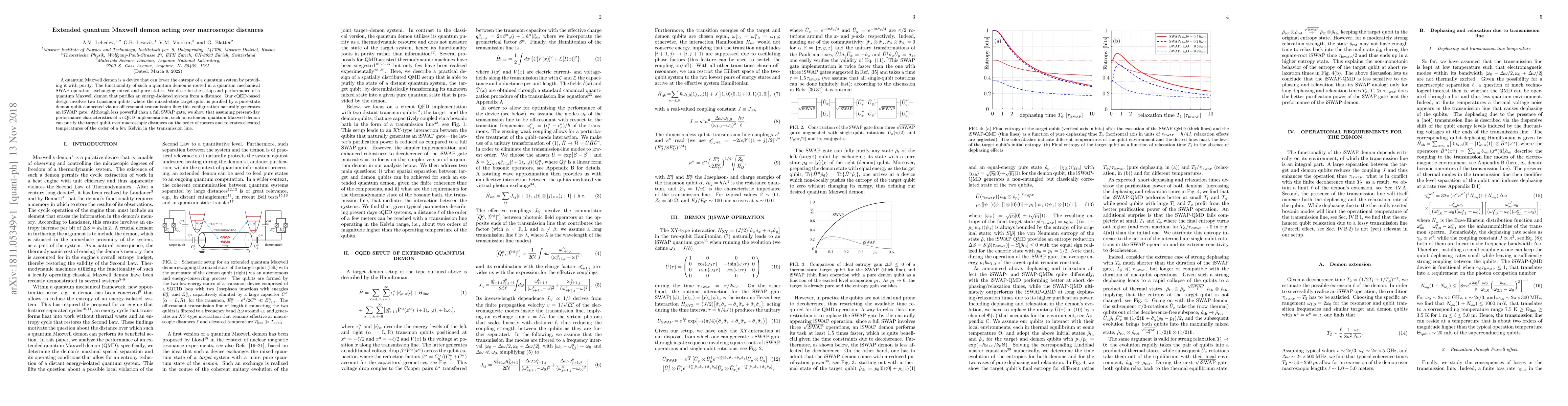 A quantum Maxwell demon is a device that can lower the entropy of a quantum system by providing it with purity. The functionality of such a quantum demon is rooted in a quantum mechanical SWAP operation exchanging mixed and pure states. We describe the setup and performance of a quantum Maxwell demon that purifies an energy-isolated system from a distance. Our cQED-based design involves two transmon qubits, where the mixed-state target qubit is purified by a pure-state demon qubit connected via an off-resonant transmission line; this configuration naturally generates an iSWAP gate. Although less powerful than a full SWAP gate, we show that assuming present-day performance characteristics of a cQED implementation, such an extended quantum Maxwell demon can purify the target qubit over macroscopic distances on the order of meters and tolerates elevated temperatures of the order of a few Kelvin in the transmission line.
