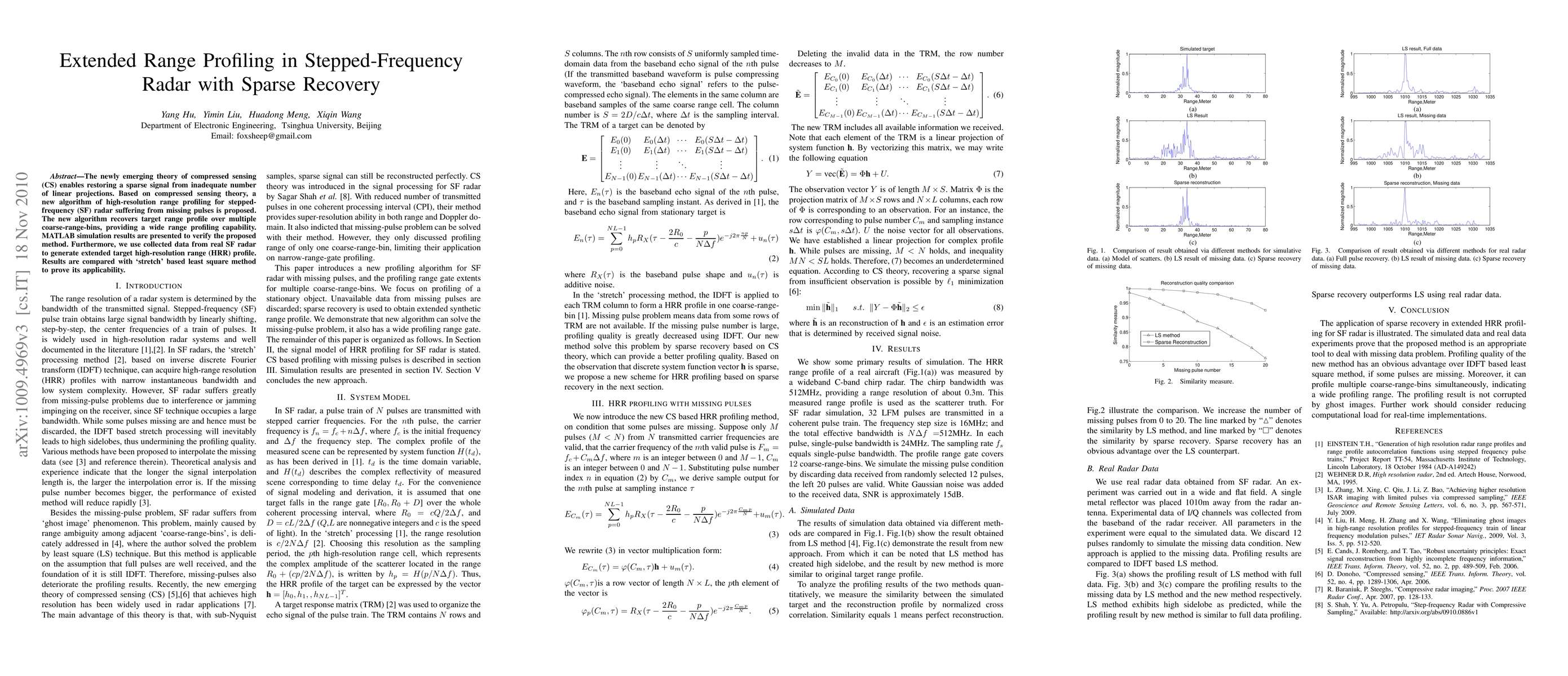 A new algorithm for stepped-frequency radar with sparse recovery is proposed to restore high-resolution range profiles from incomplete data, offering a wide range profiling capability.