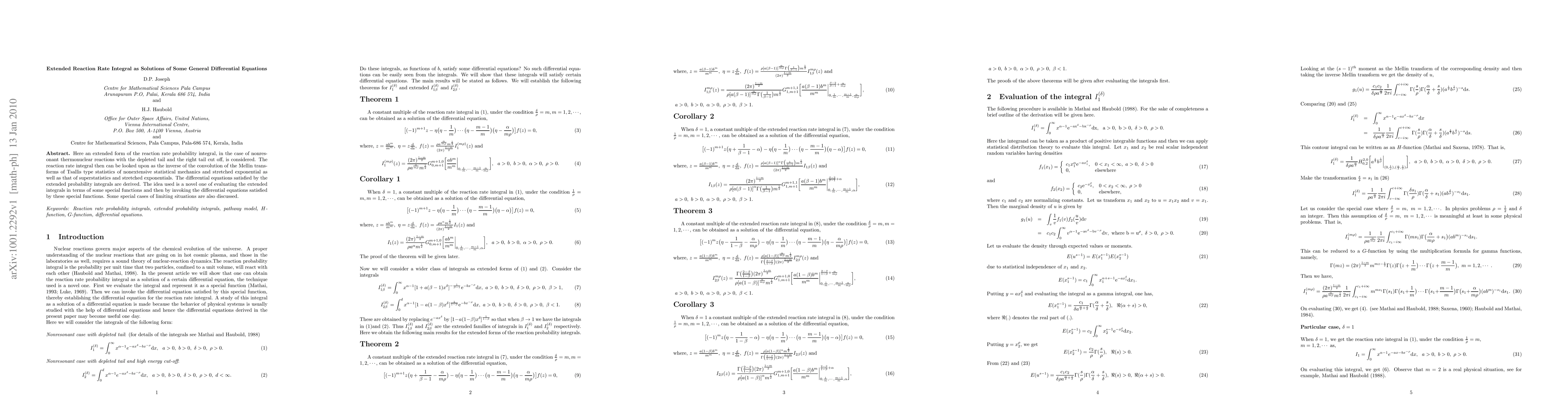 Here an extended form of the reaction rate probability integral, in the case of nonresonant thermonuclear reactions with the depleted tail and the right tail cut off, is considered. The reaction rate integral then can be looked upon as the inverse of the convolution of the Mellin transforms of Tsallis type statistics of nonextensive statistical mechanics and stretched exponential as well as that of superstatistics and stretched exponentials. The differential equations satisfied by the extended probability integrals are derived. The idea used is a novel one of evaluating the extended integrals in terms of some special functions and then by invoking the differential equations satisfied by these special functions. Some special cases of limiting situations are also discussed.