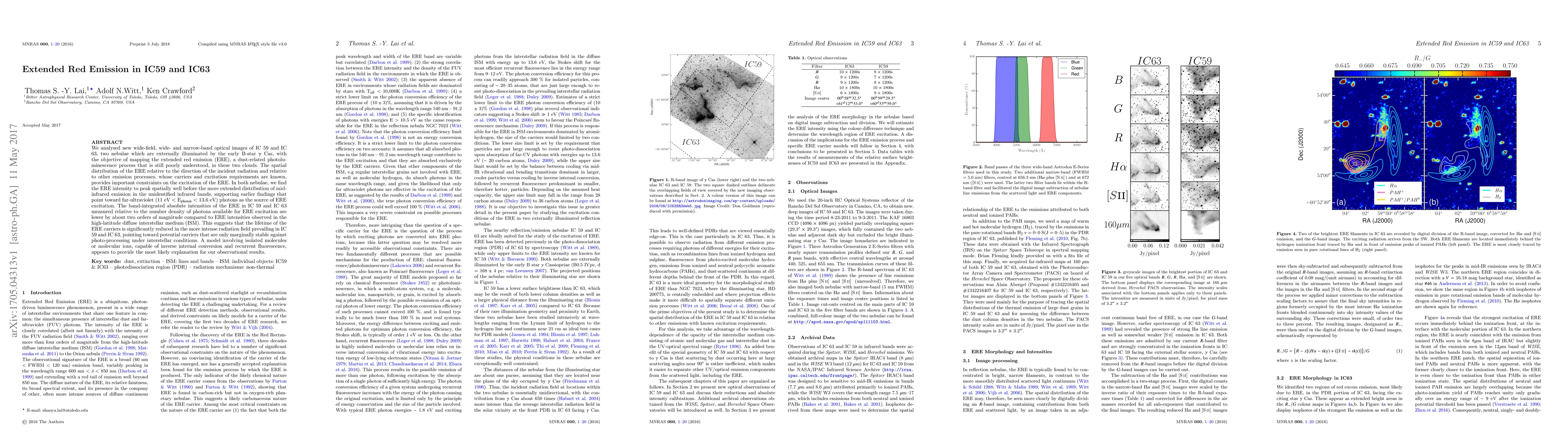 We analysed new wide-field, wide- and narrow-band optical images of IC 59 and IC 63, two nebulae which are externally illuminated by the early B-star {\gamma} Cas, with the objective of mapping the extended red emission (ERE), a dust-related photoluminescence process that is still poorly understood, in these two clouds. The spatial distribution of the ERE relative to the direction of the incident radiation and relative to other emission processes, whose carriers and excitation requirements are known, provides important constraints on the excitation of the ERE. In both nebulae, we find the ERE intensity to peak spatially well before the more extended distribution of mid-infrared emission in the unidentified infrared bands, supporting earlier findings that point toward far-ultraviolet (11 eV < E$_\mathrm{{photon}}$ < 13.6 eV) photons as the source of ERE excitation. The band-integrated absolute intensities of the ERE in IC 59 and IC 63 measured relative to the number density of photons available for ERE excitation are lower by about two orders of magnitude compared to ERE intensities observed in the high-latitude diffuse interstellar medium (ISM). This suggests that the lifetime of the ERE carriers is significantly reduced in the more intense radiation field prevailing in IC 59 and IC 63, pointing toward potential carriers that are only marginally stable against photo-processing under interstellar conditions. A model involving isolated molecules or molecular ions, capable of inverse internal conversion and recurrent fluorescence, appears to provide the most likely explanation for our observational results.