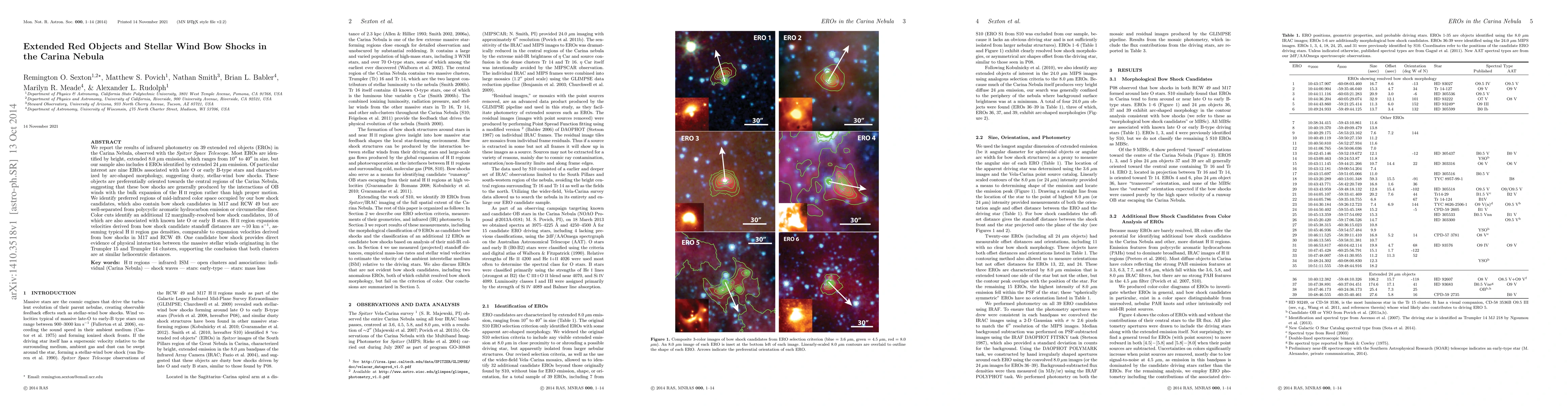 We report the results of infrared photometry on 39 extended red objects (EROs) in the Carina Nebula, observed with the Spitzer Space Telescope. Most EROs are identified by bright, extended 8.0 um emission, which ranges from 10'' to 40'' in size, but our sample also includes 4 EROs identified by extended 24 um emission. Of particular interest are nine EROs associated with late O or early B-type stars and characterized by arc-shaped morphology, suggesting dusty, stellar-wind bow shocks. These objects are preferentially oriented towards the central regions of the Carina Nebula, suggesting that these bow shocks are generally produced by the interactions of OB winds with the bulk expansion of the H II region rather than high proper motion. We identify preferred regions of mid-infrared color space occupied by our bow shock candidates, which also contain bow shock candidates in M17 and RCW 49 but are well-separated from polycyclic aromatic hydrocarbon emission or circumstellar discs. Color cuts identify an additional 12 marginally-resolved bow shock candidates, 10 of which are also associated with known late O or early B stars. H II region expansion velocities derived from bow shock candidate standoff distances are ~10 km/s, assuming typical H II region gas densities, comparable to expansion velocities derived from bow shocks in M17 and RCW 49. One candidate bow shock provides direct evidence of physical interaction between the massive stellar winds originating in the Trumpler 15 and Trumpler 14 clusters, supporting the conclusion that both clusters are at similar heliocentric distances.