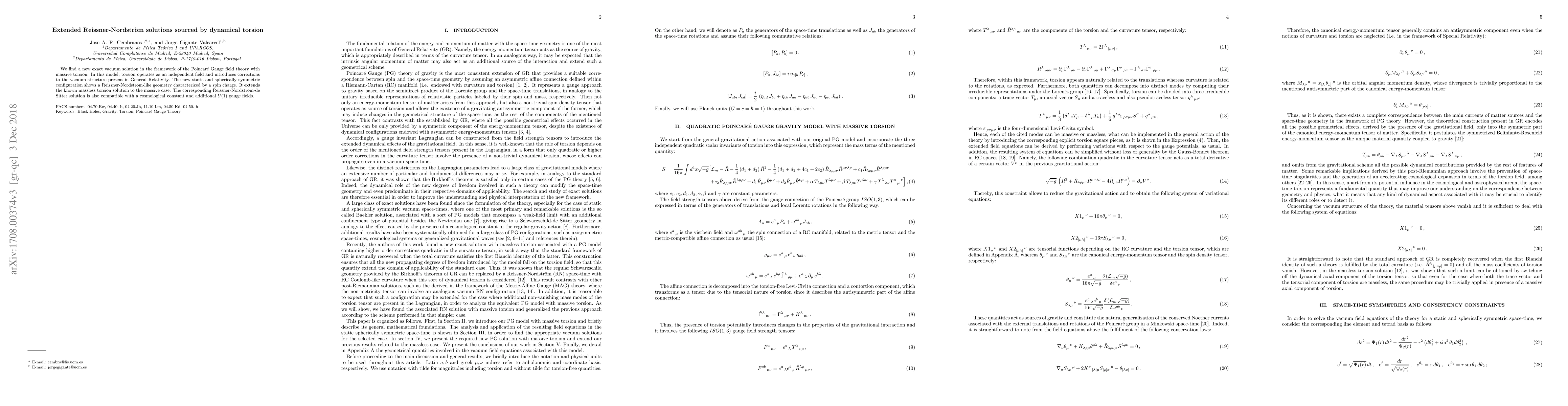 This paper presents a new exact vacuum solution in Poincaré gauge theory with massive torsion, extending Reissner-Nordström geometry to include torsion. It introduces a static, spherically symmetric configuration with a spin charge and is compatible with a cosmological constant and additional U(1) gauge fields.