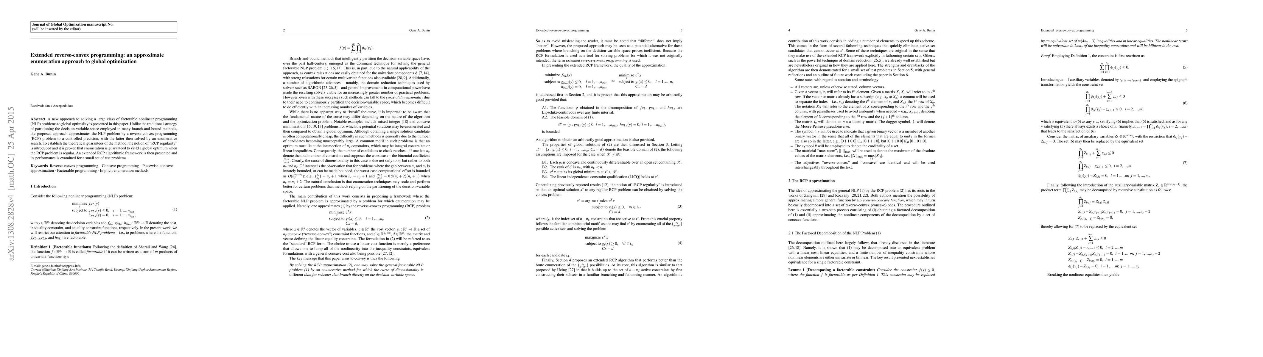 A new approach to solving a large class of factorable nonlinear programming (NLP) problems to global optimality is presented in this paper. Unlike the traditional strategy of partitioning the decision-variable space employed in many branch-and-bound methods, the proposed approach approximates the NLP problem by a reverse-convex programming (RCP) problem to a controlled precision, with the latter then solved by an enumerative search. To establish the theoretical guarantees of the method, the notion of "RCP regularity" is introduced and it is proven that enumeration is guaranteed to yield a global optimum when the RCP problem is regular. An extended RCP algorithmic framework is then presented and its performance is examined for a small set of test problems.