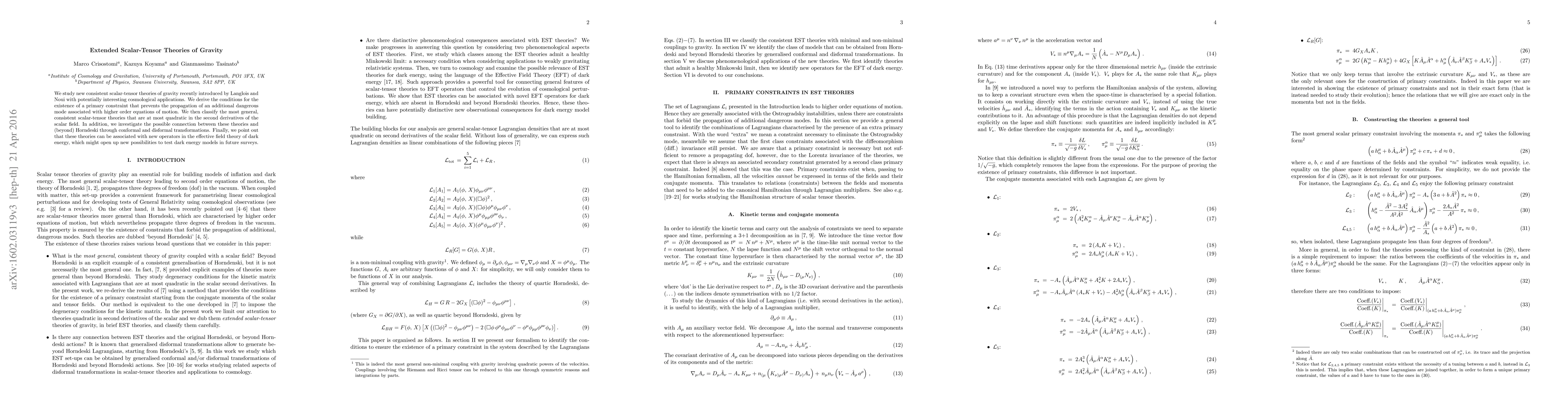This paper explores new scalar-tensor gravity theories, identifying conditions to avoid extra modes in higher-order equations and classifying general consistent theories quadratic in second scalar derivatives. It also examines their connections to Horndeski theories via conformal and disformal transformations, and suggests potential applications in testing dark energy models.