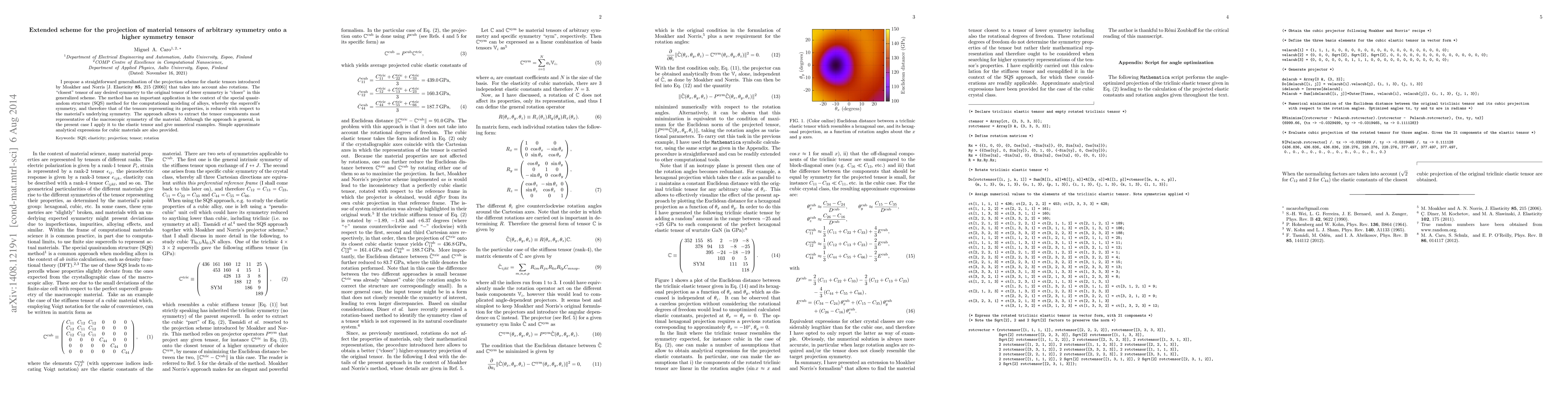 I propose a straightforward generalization of the projection scheme for elastic tensors introduced by Moakher and Norris [J. Elasticity 85, 215 (2006)] that takes into account also rotations. The "closest" tensor of any desired symmetry to the original tensor of lower symmetry is "closer" in this generalized scheme. The method has an important application in the context of the special quasirandom structure (SQS) method for the computational modeling of alloys, whereby the supercell's symmetry, and therefore that of the tensors representing its properties, is reduced with respect to the material's underlying symmetry. The approach allows to extract the tensor components most representative of the macroscopic symmetry of the material. Although the approach is general, in the present case I apply it to the elastic tensor and give numerical examples. Simple approximate analytical expressions for cubic materials are also provided.
