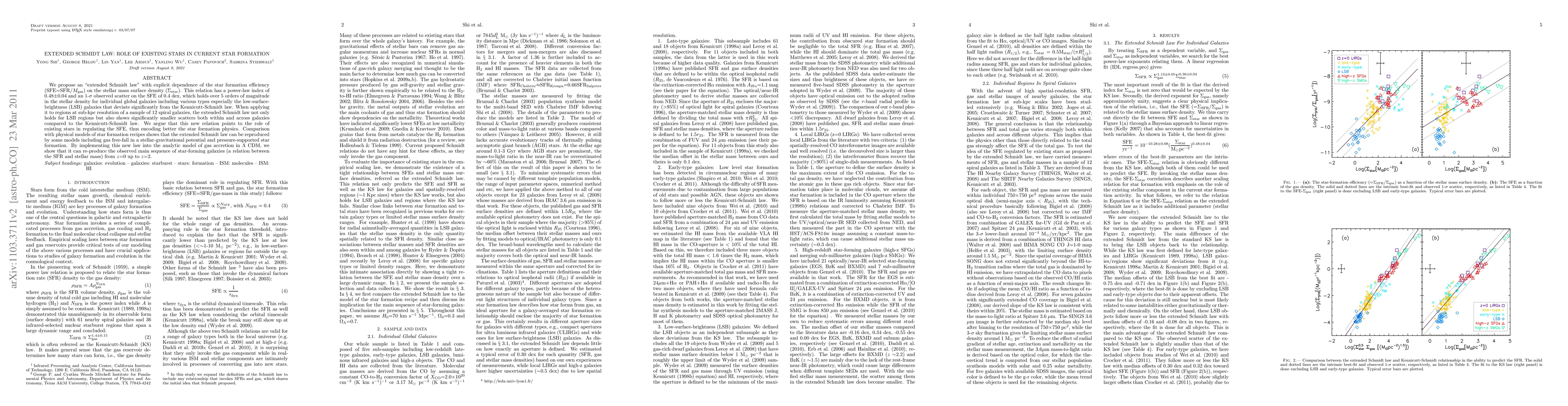 The paper proposes an extended Schmidt law that links star formation efficiency to stellar mass surface density, showing a power-law index of 0.48±0.04 and smaller scatter than the Kennicutt-Schmidt law, suggesting existing stars regulate star formation efficiency. This new relation can reproduce the observed main sequence of star-forming galaxies up to z=2.