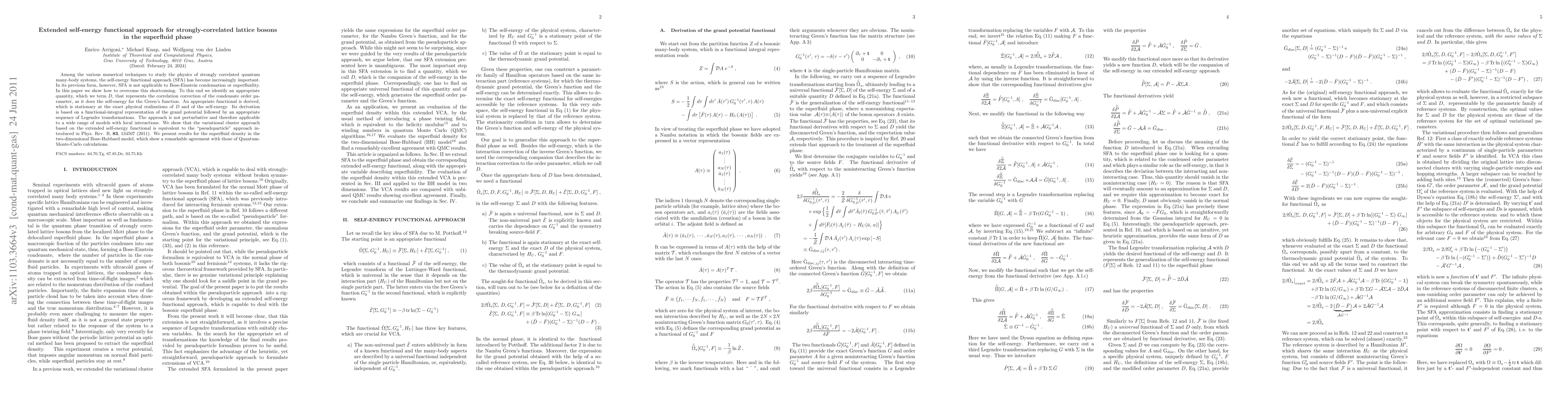 Among the various numerical techniques to study the physics of strongly correlated quantum many-body systems, the self-energy functional approach (SFA) has become increasingly important. In its previous form, however, SFA is not applicable to Bose-Einstein condensation or superfluidity. In this paper we show how to overcome this shortcoming. To this end we identify an appropriate quantity, which we term $D$, that represents the correlation correction of the condensate order parameter, as it does the self-energy for the Green's function. An appropriate functional is derived, which is stationary at the exact physical realizations of $D$ and of the self-energy. Its derivation is based on a functional-integral representation of the grand potential followed by an appropriate sequence of Legendre transformations. The approach is not perturbative and therefore applicable to a wide range of models with local interactions. We show that the variational cluster approach based on the extended self-energy functional is equivalent to the "pseudoparticle" approach introduced in Phys. Rev. B, 83, 134507 (2011). We present results for the superfluid density in the two-dimensional Bose-Hubbard model, which show a remarkable agreement with those of Quantum-Monte-Carlo calculations.